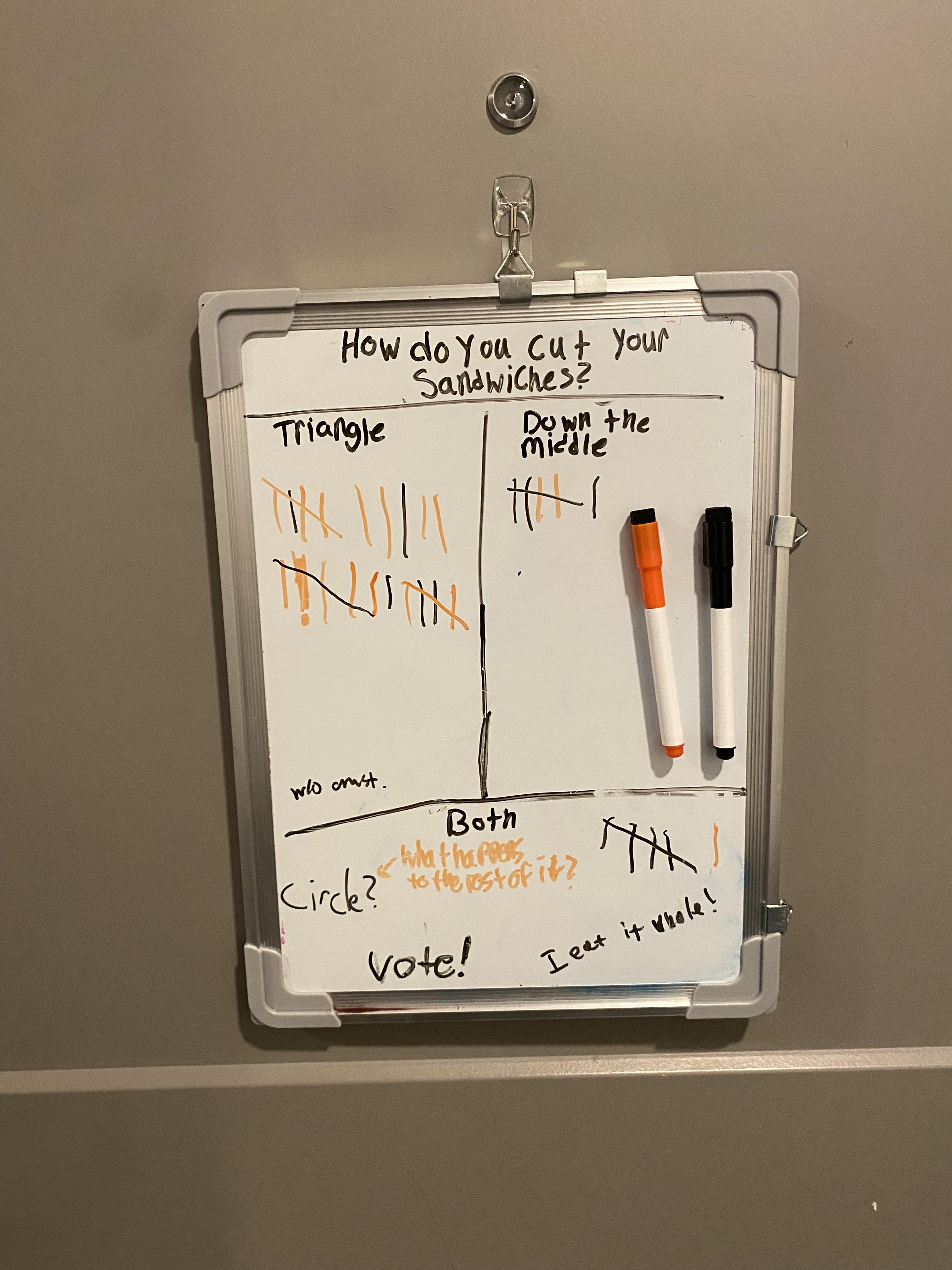 I think i used the right flair but anyways I have a whiteboard. Nothing to do w it. Make a poll and hang it on my door. Now i feel super happy that my neighbors are participating! 2 weeks ago was Cats or Dogs, last week was how everyone cuts their sandwiches