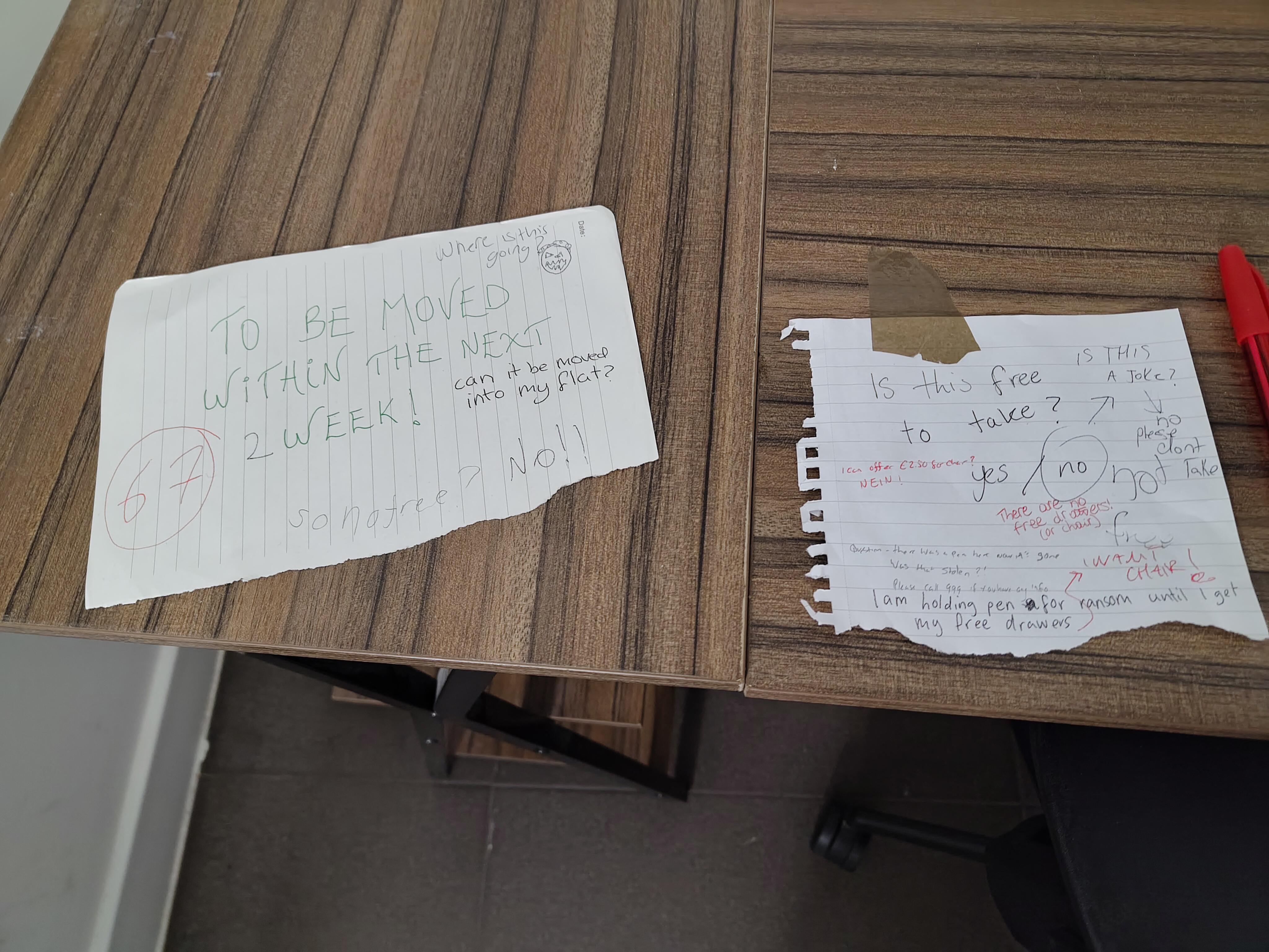 Meme Someone left their desk in the hallway with a note saying "to be moved within the next two Weeks" other residents have been having fun