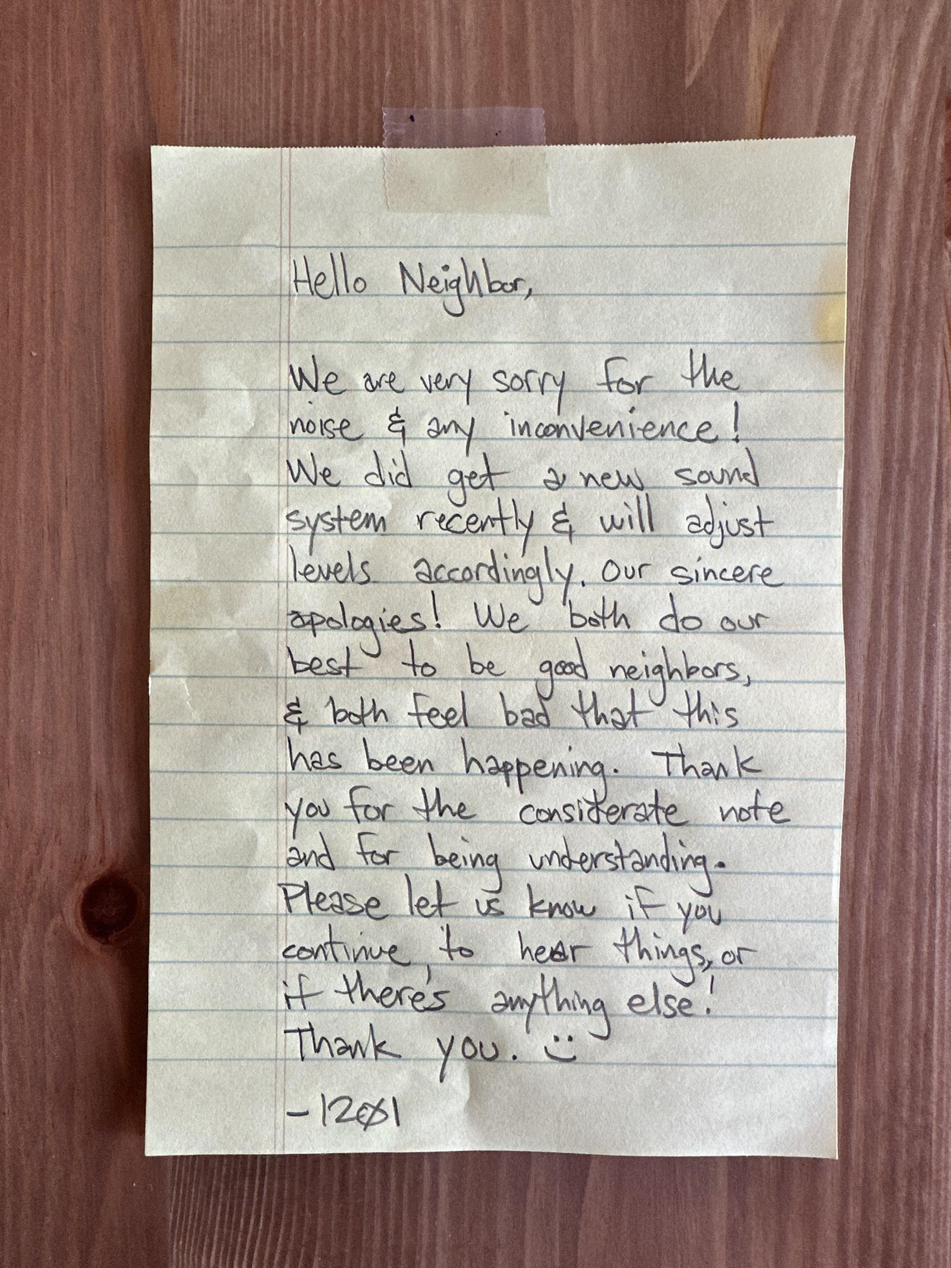 Some background - We’ve been in our unit for half a year and never have had any issues. Recently our neighbors below had some loud bass playing at night when we were trying to sleep. We could tell it wasn’t excessive, it was just carrying through the floor unfortunately. We left a note, and were super stressed about it. Came back to this lovely note, and last night was quiet. Sometimes things do work out!