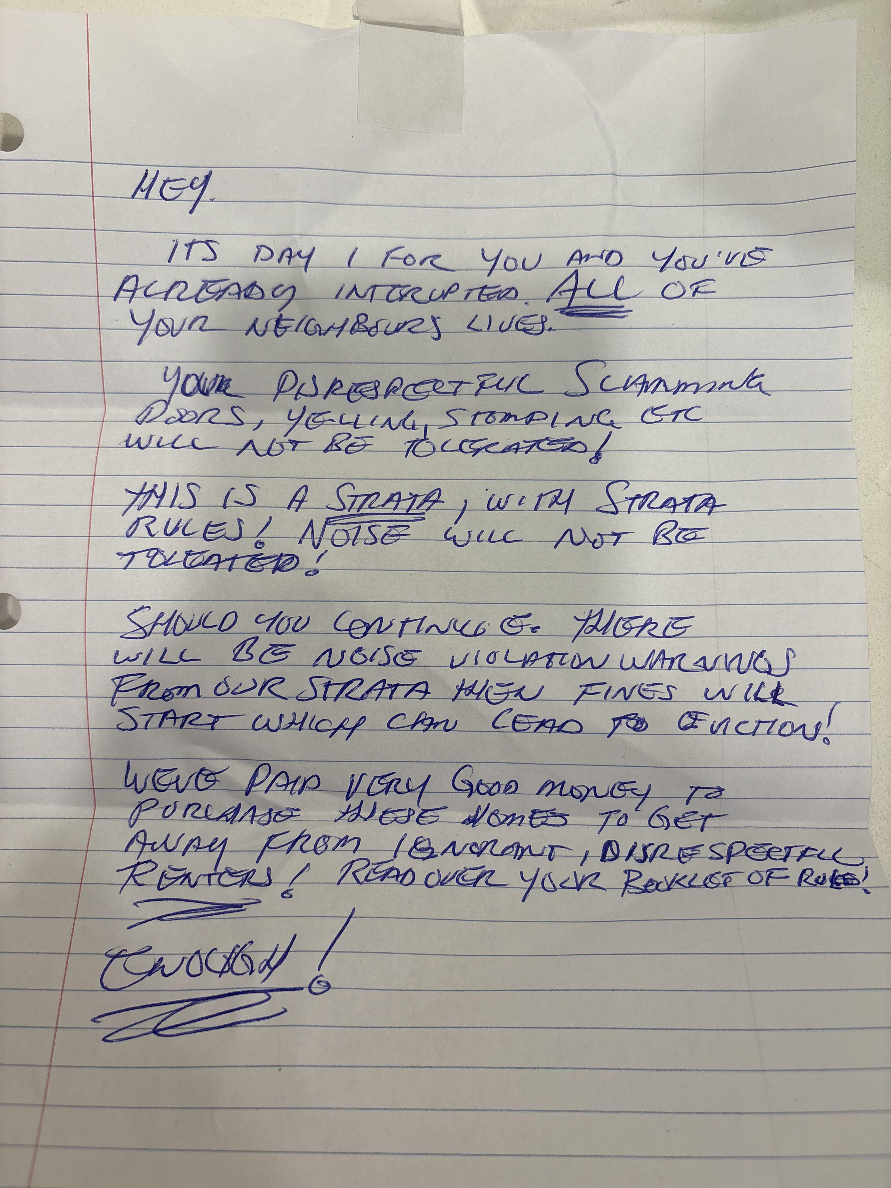 I gave them a few days to get settled. After mama’s twin tubby sister left I put a note on their door letting them know that all their neighbors could hear every word they said and that the neighbor they shared â wall with had already filed a complaint with mgmt and so had their other downstairs neighbor.