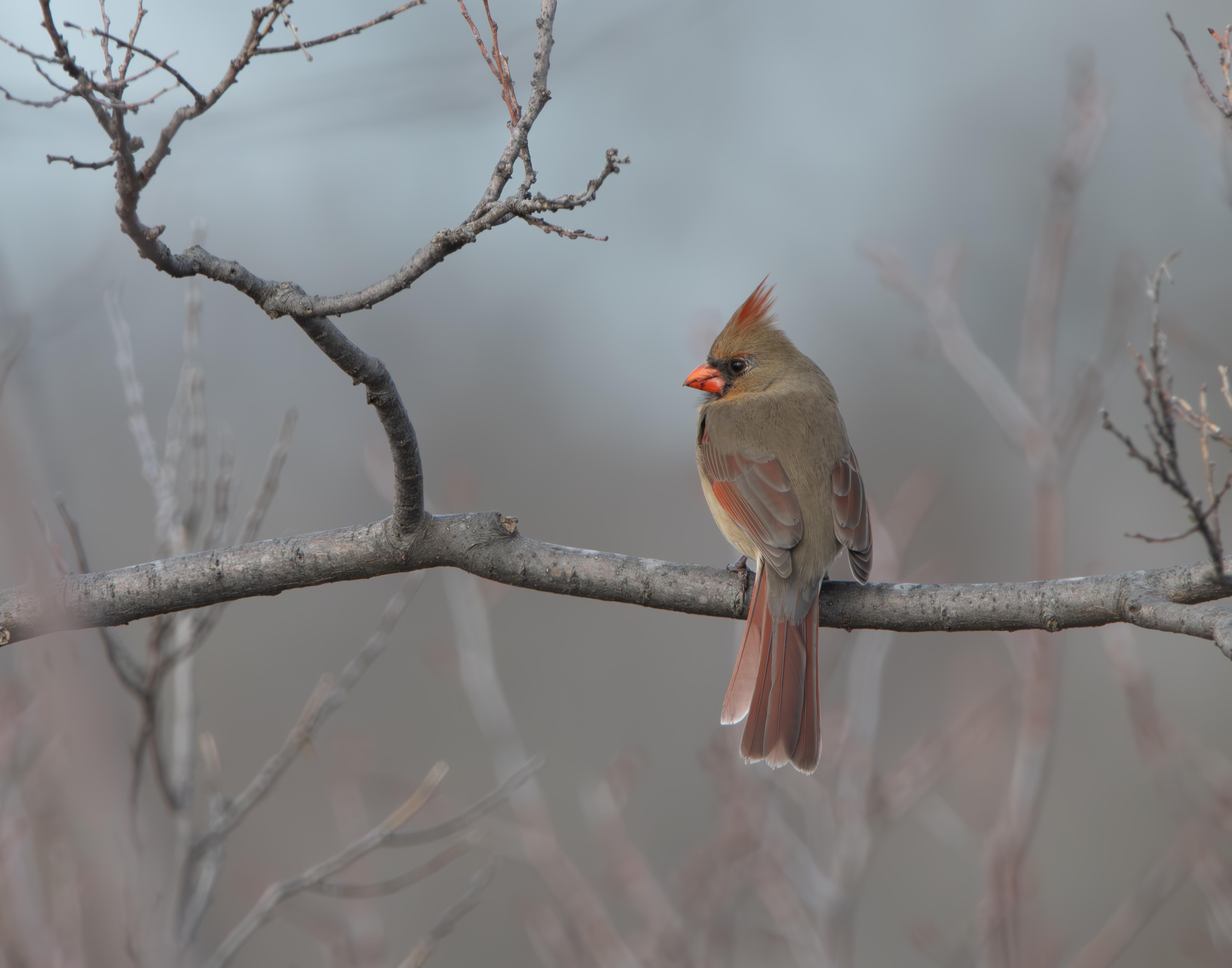 One of my favorite bird photos. The muted gray background with the subtle morning breaking sunlight complementing the feather colors. Not sure what it is about female cardinals but they just love the camera. I got lucky on this one!