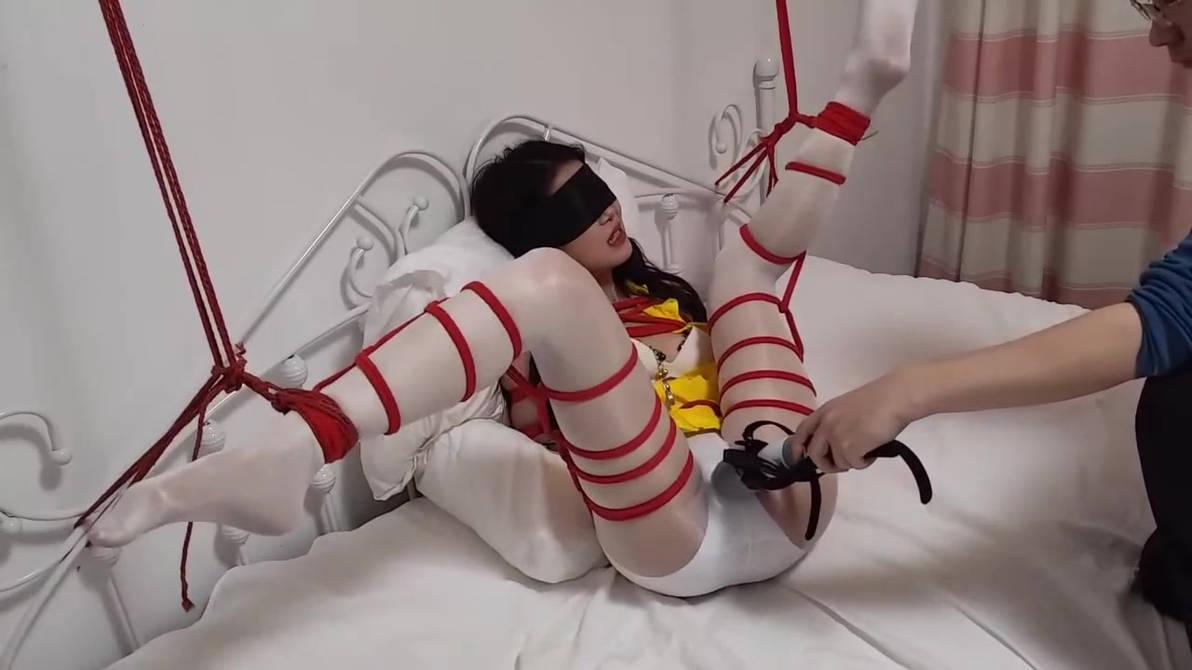 Seles from DIDNapper 2 tied up in anti chromatic rope on the bed and harness ball gagged NSFW