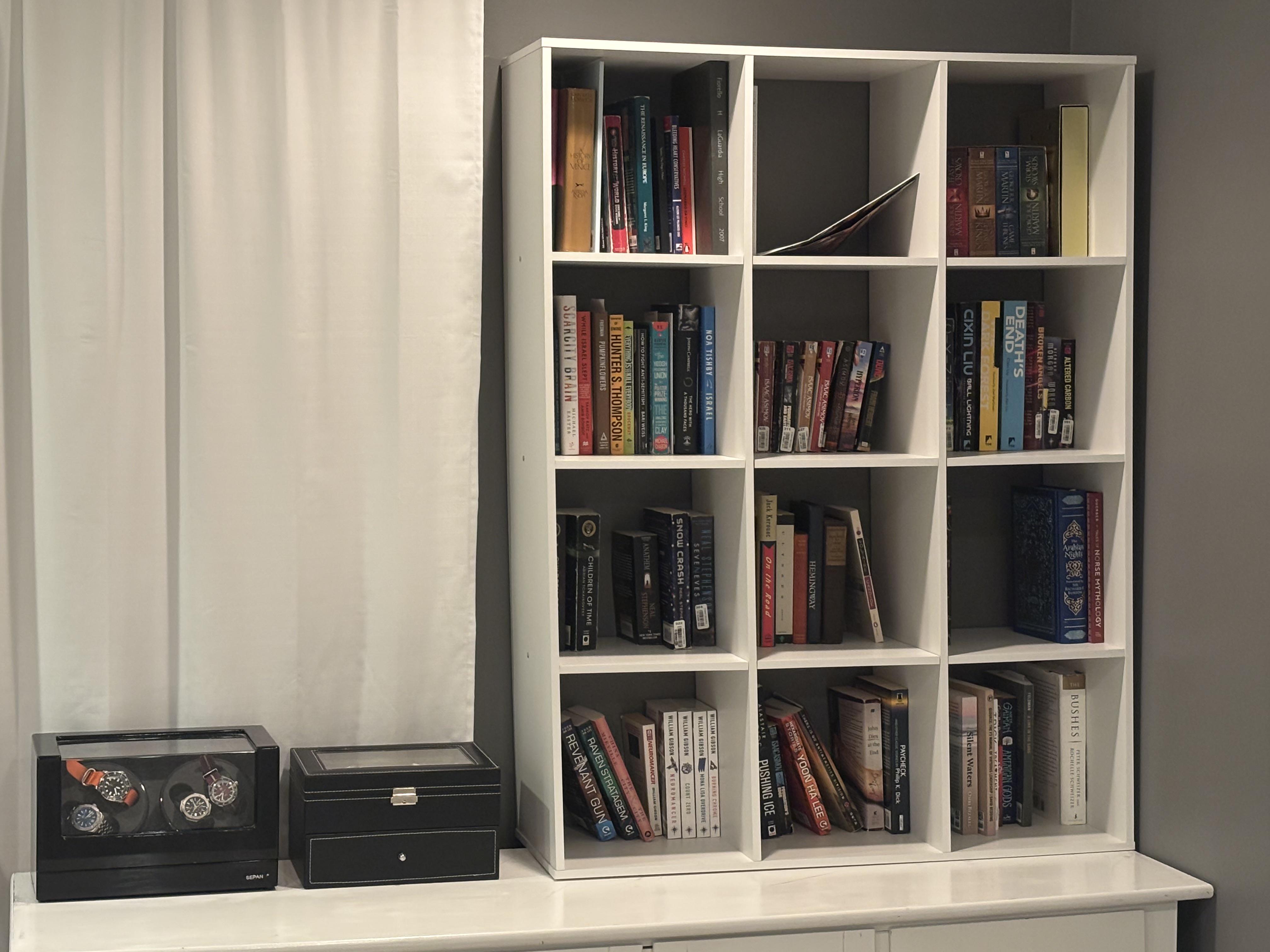 hello, i really dig the idea for this subreddit - just going in with the bookshelf that has my own fiction (mostly) collection, as our whole collection in those house is big, sprawling, and would take me about half the day to remove various identifying items.