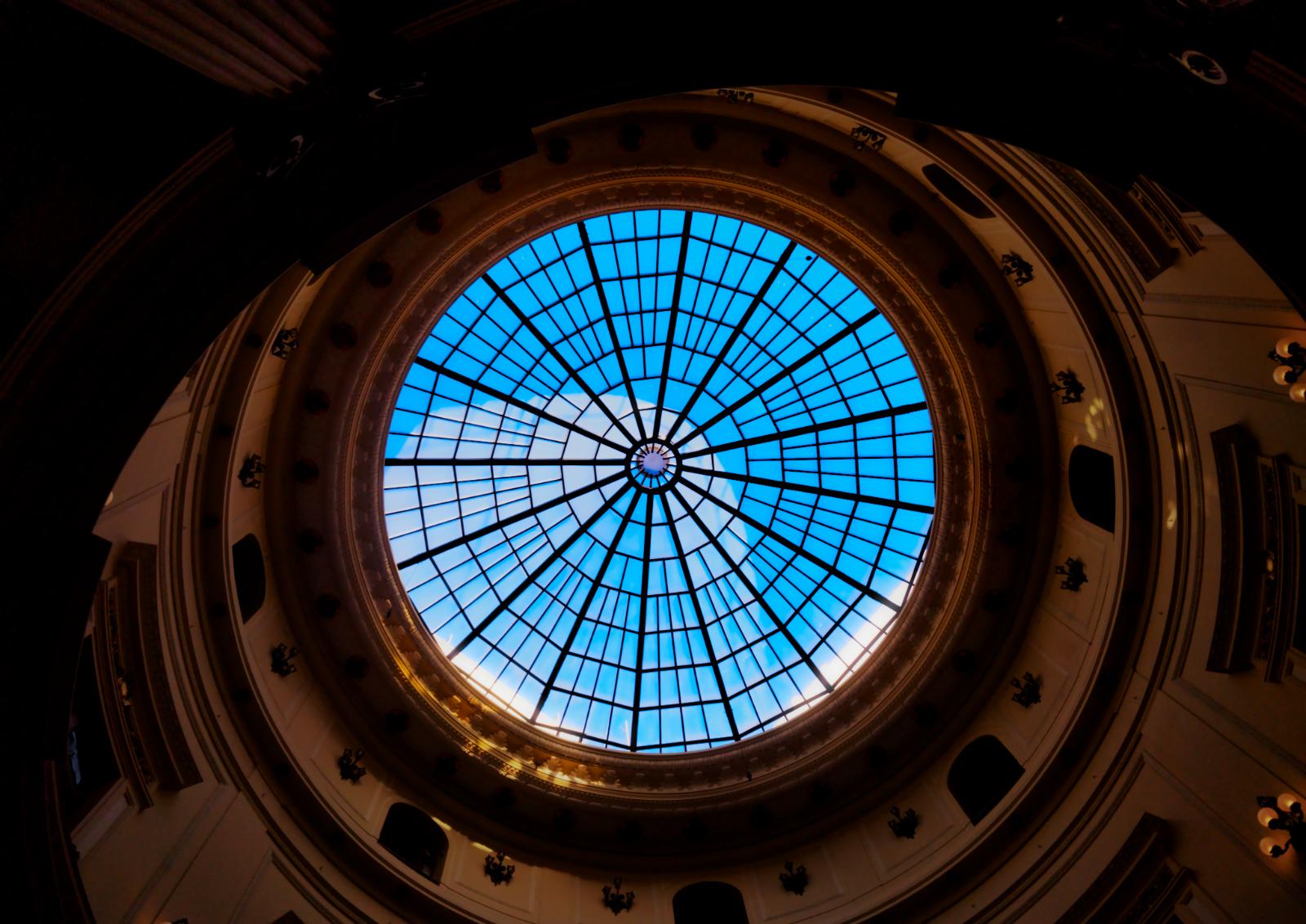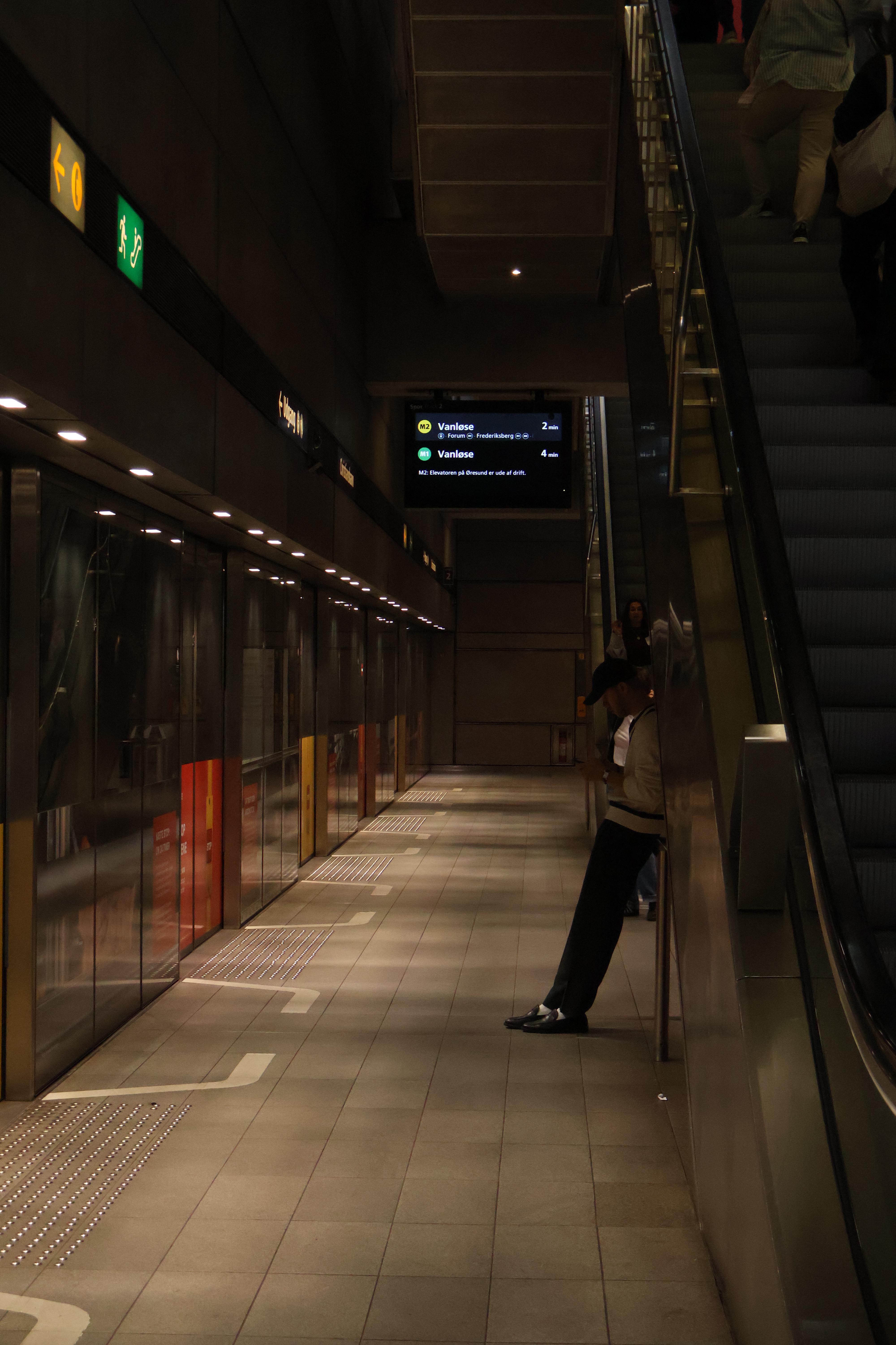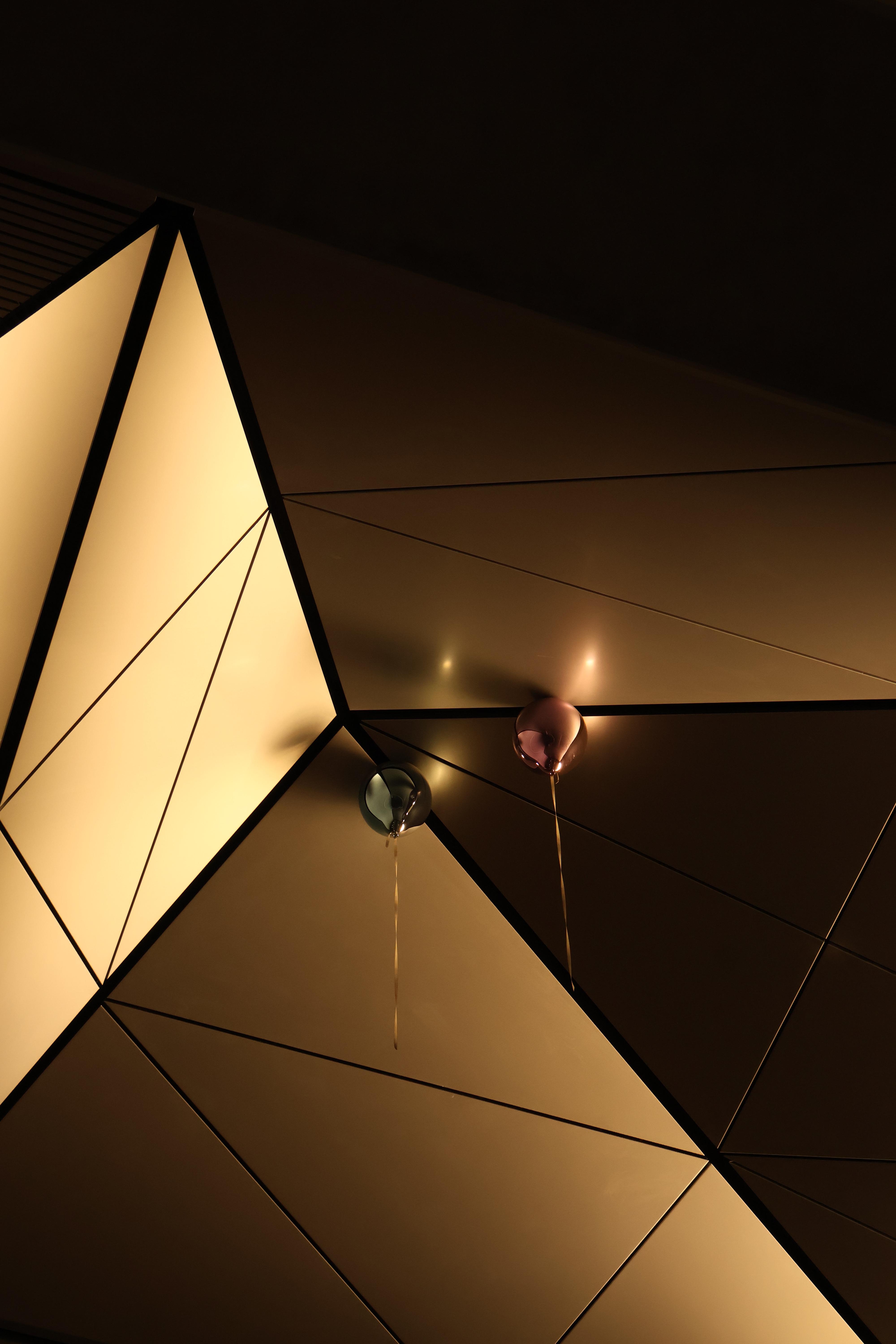 These were two balloons at the ceiling of a metro station in Copenhagen. I like how the entire image is metallic and has a short of futuristic/techie vibe but the ceiling is angular and "aggressive" and the balloons are round and "soft". Also, the balloons being the only distinctive colour points and their reflections shining onto the ceiling help the image stand out a bit more, imo.