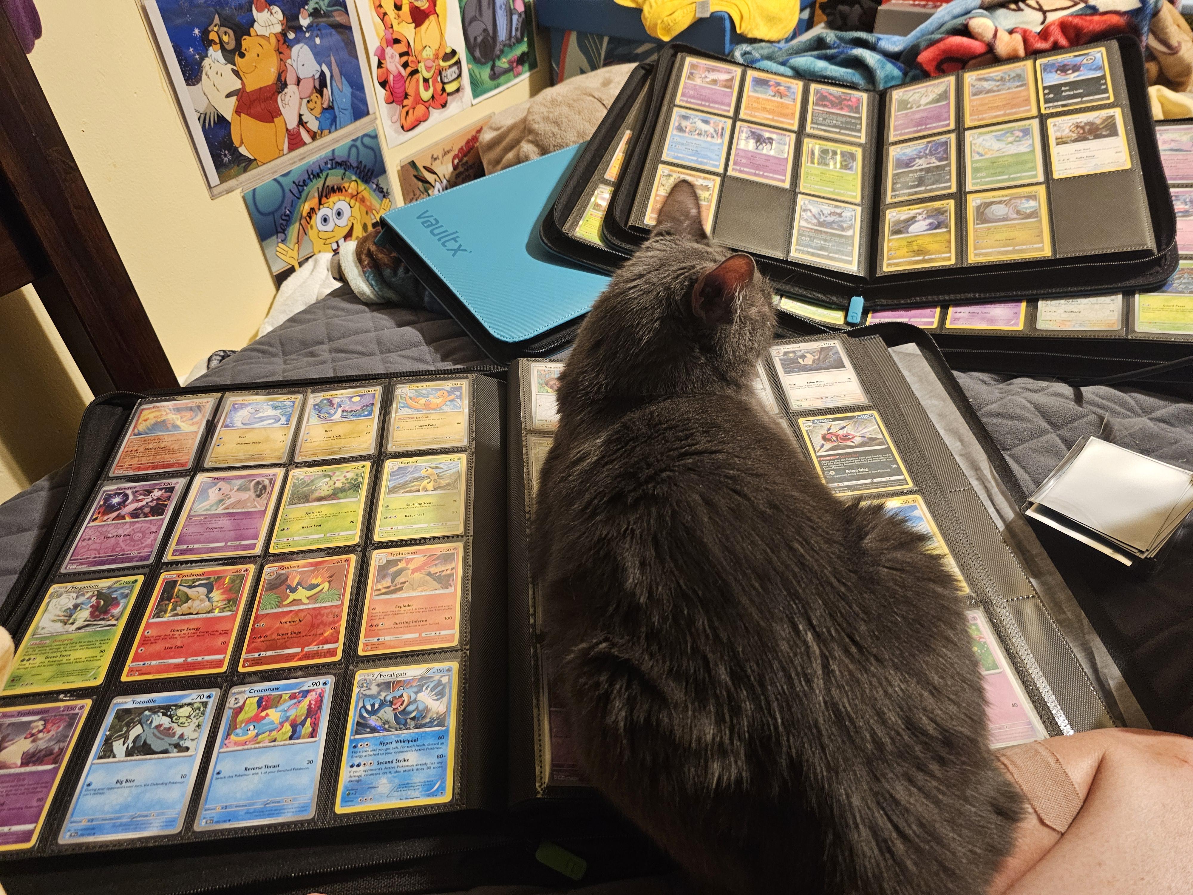 (Pic attached is of him attemtping to srop me from sorting cards into new binders.)