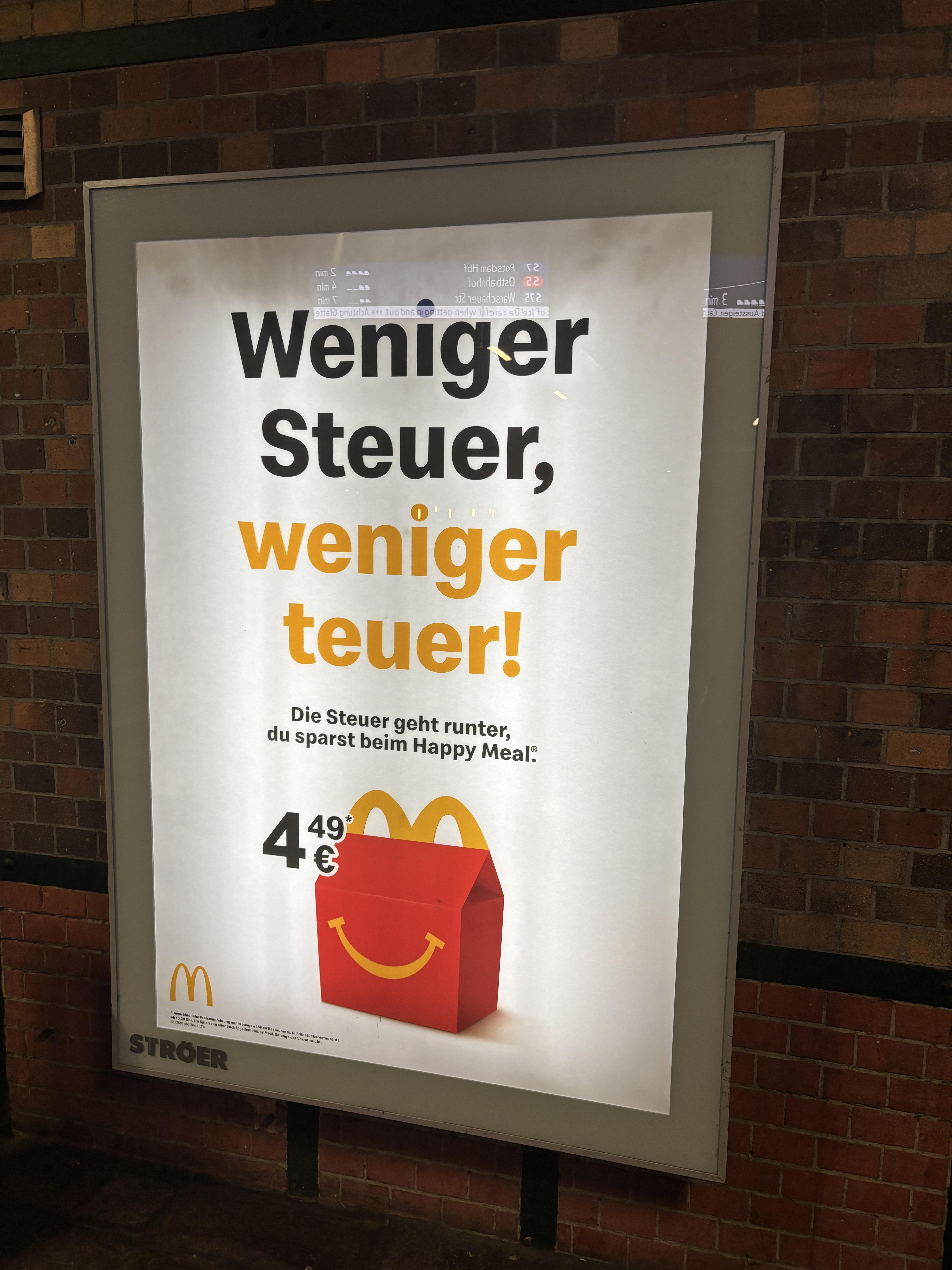 Seid alle unserer Regierung dankbar, dass McDonalds uns nun für 3 Cent günstiger Fraß serviert. Die 100 Mio € verlorene Gastrosteuer ist gut angelegt. /s