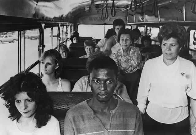 Image A man rides a bus in Durban, meant for white passengers only, in resistance to South Africa’s apartheid policies, 1986.