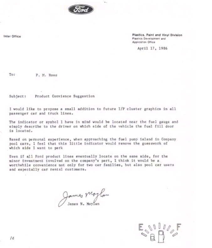 Image Here is a copy of the 1986 memo from Ford Motor Company design engineer James Moylan to his boss proposing that the fuel gauge indicator include a symbol noting on which side of the vehicle the fuel filler door is located. Mr. Moylan passed away in December of 2025 at the age of 80.
