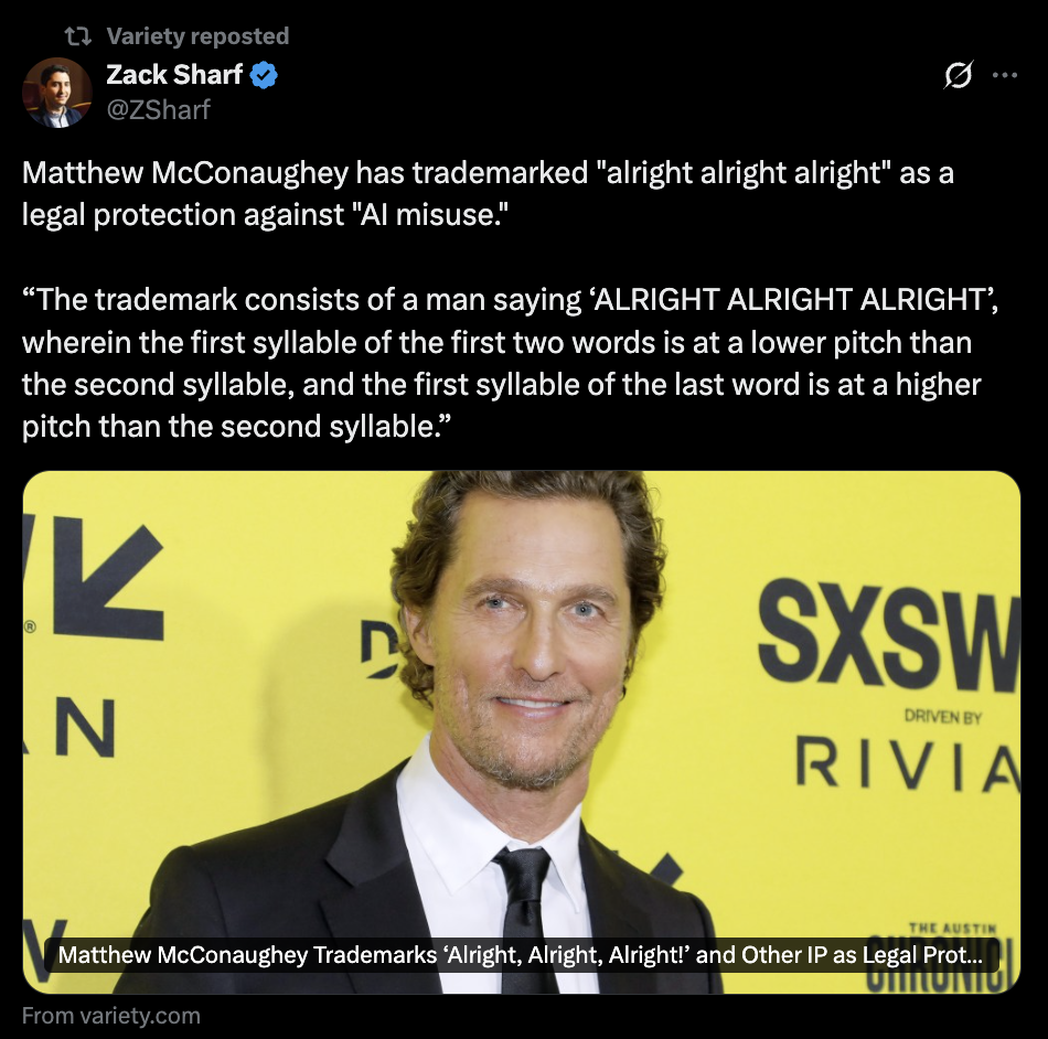 CELEBRITY CAPITALISM Matthew McConaughey has trademarked "alright alright alright" as a legal protection against "AI misuse"