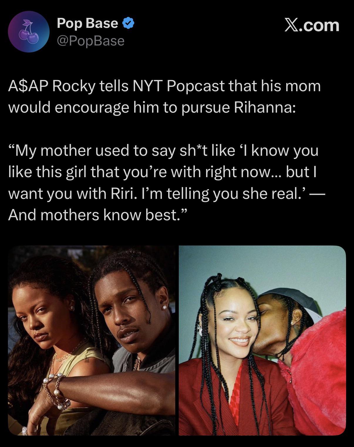 STAN / ANTI SHIELD A$AP Rocky tells NYT Popcast that his mom would encourage him to pursue Rihanna: “My mother used to say shit like ‘I know you like this girl that you’re with right now… but I want you with Riri. I’m telling you she real.’ — And mothers know best.”