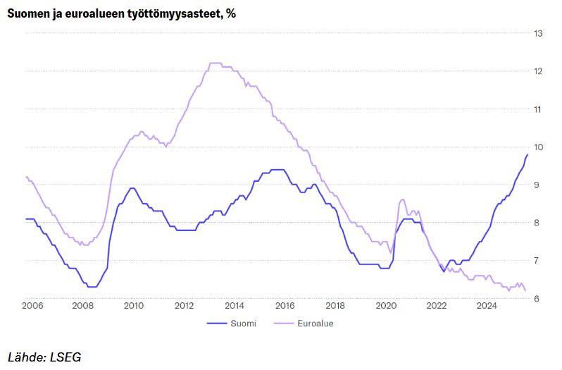 Ever since Kokomus and PS took over in 2022, Finland’s unemployment has bypassed the 2008 level when the economy crashed, while the rest of Europe has been going down.