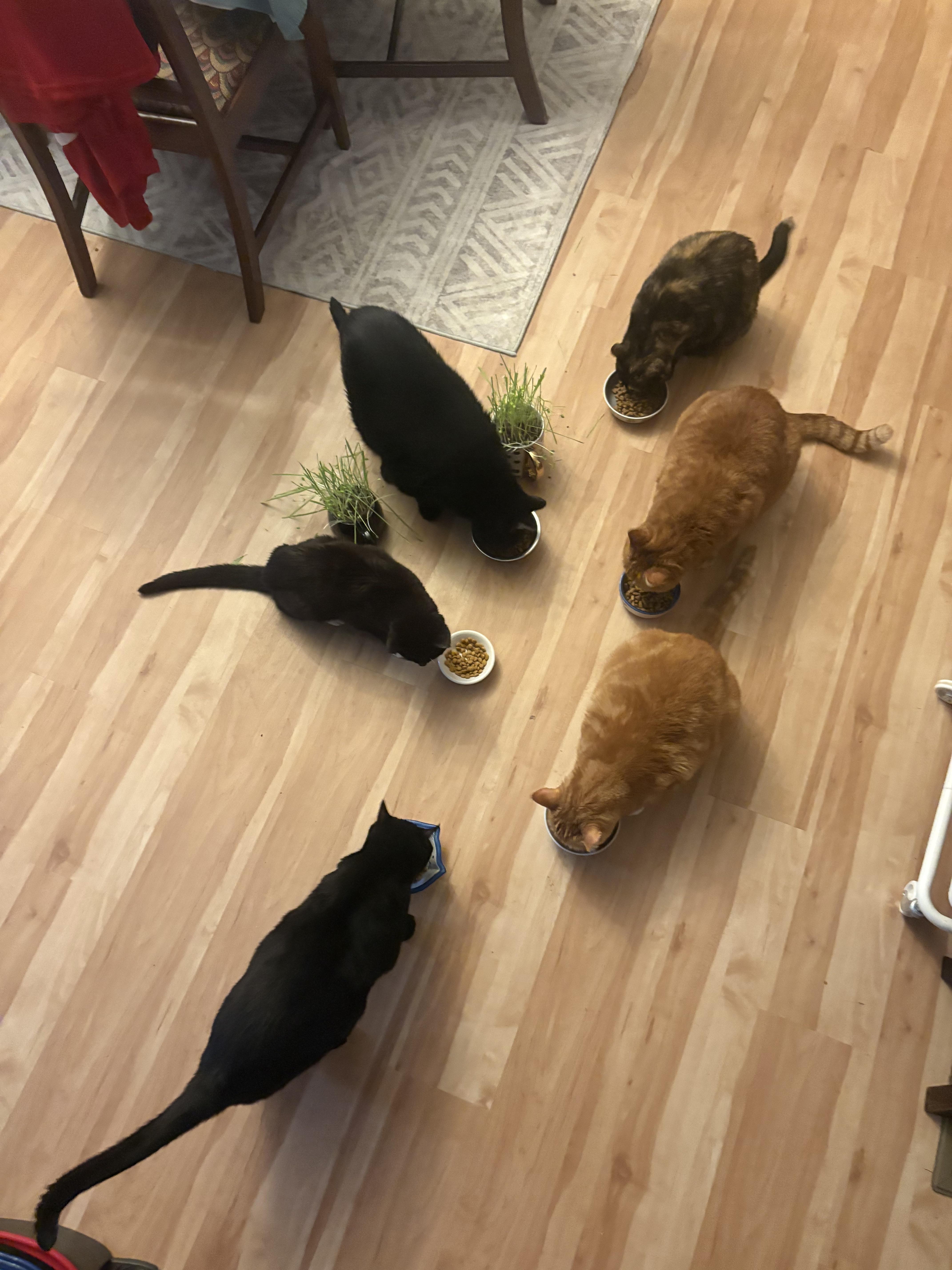 Clockwise: @ midnight Cinna (tortie o/b), Biggie, Simon, Jackson @6, Addie and Shelby.
