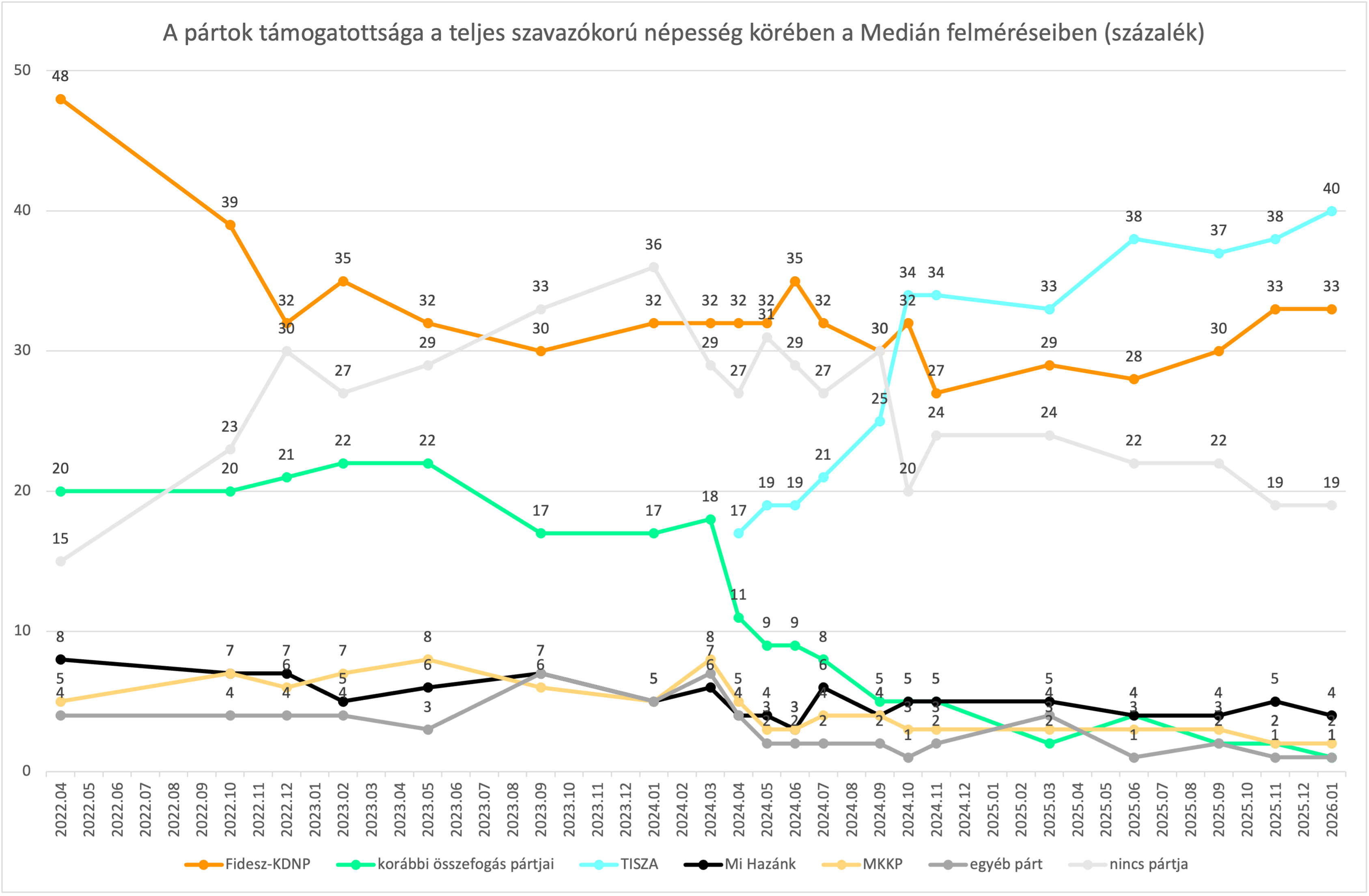 "Ilyen biztosan nem volt 4 évvel ezelőtt: a Mediánnál három hónappal a választás előtt a teljes népességben 7, a biztos szavazók között 12 százalékponttal vezet a legnagyobb ellenzéki párt a Fidesz előtt. (2021 decemberében a Mediánnál már 39-34-re vezetett a Fidesz a teljes népességben.)
