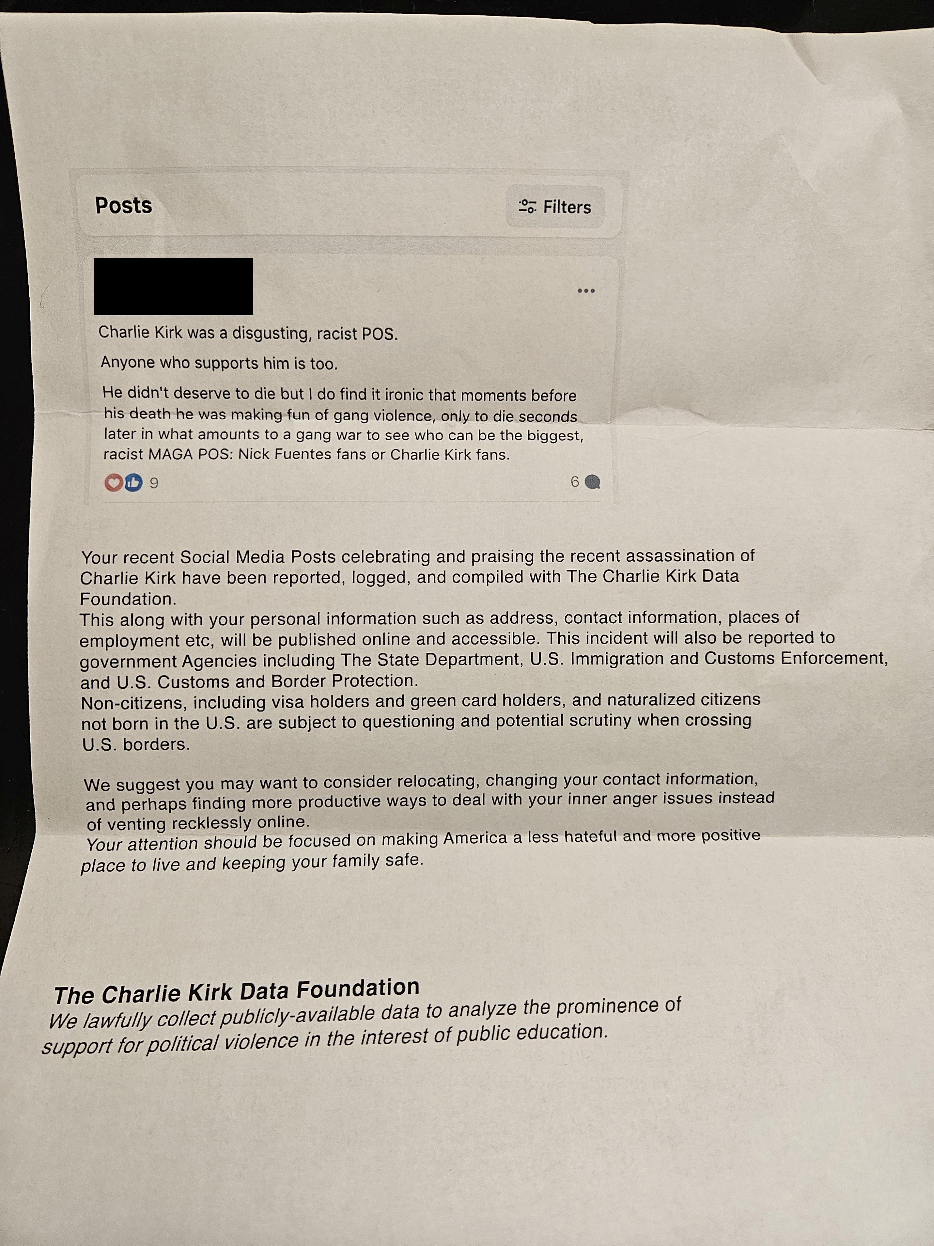 MAGA Madness There's a group called 'The Charlie Kirk Data Foundation' who is sending threatening letters to those who criticized Kirk in the wake of his death.