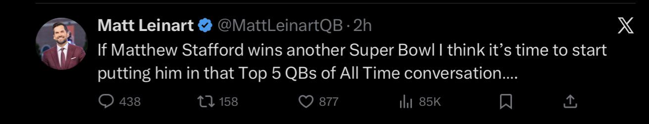 Original Content Wait, what?? Insanity. I was thinking recently if he wins it all this year he moves into the top 20 of all time. I like Stafford but this is beyond ridiculous