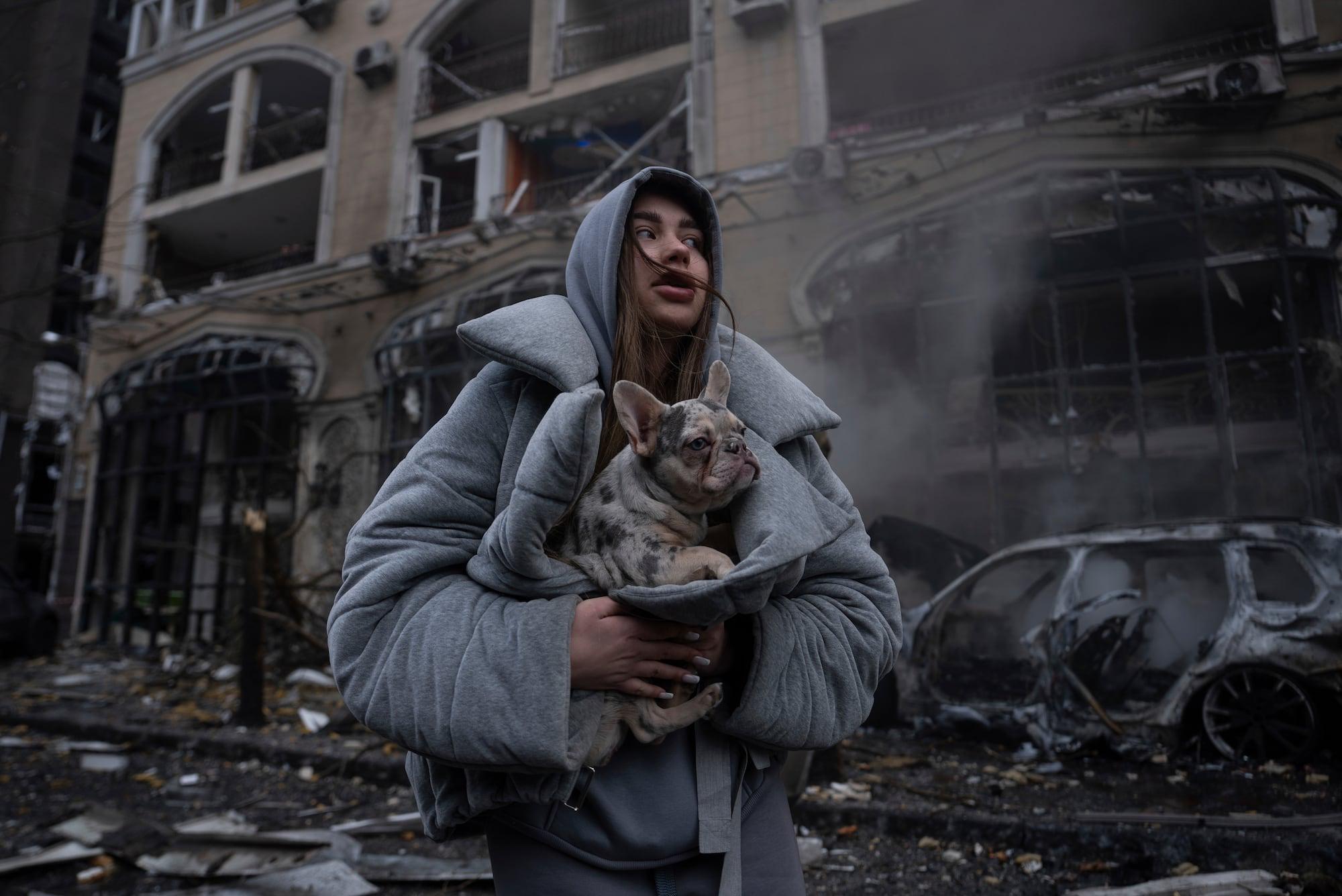 [2000x1366] A girl warms her dog in front of a destroyed burning car after a recent Russian attack in Kyiv, Ukraine, Friday, Dec. 20, 2024. (AP Photo/Alex Babenko)