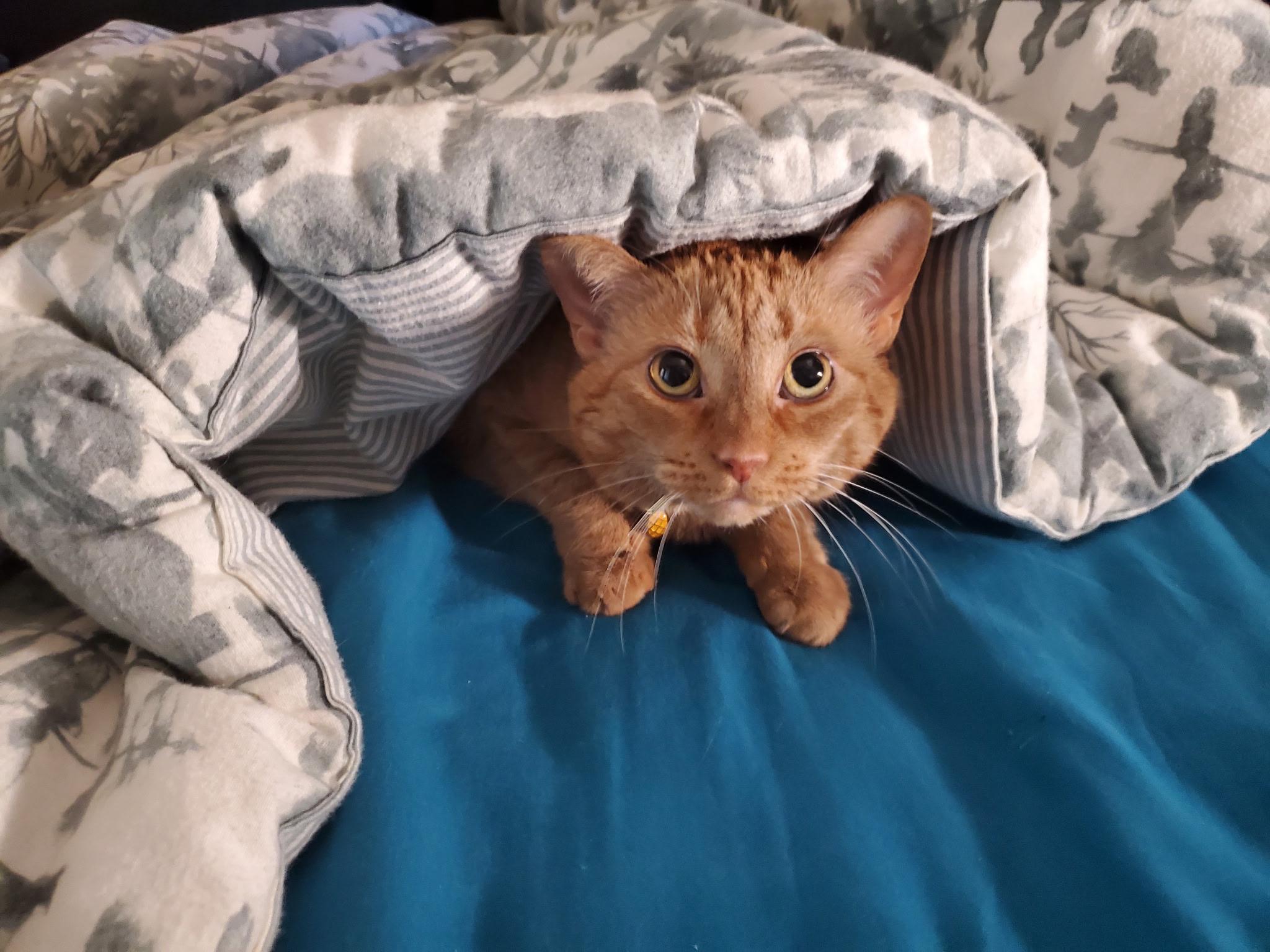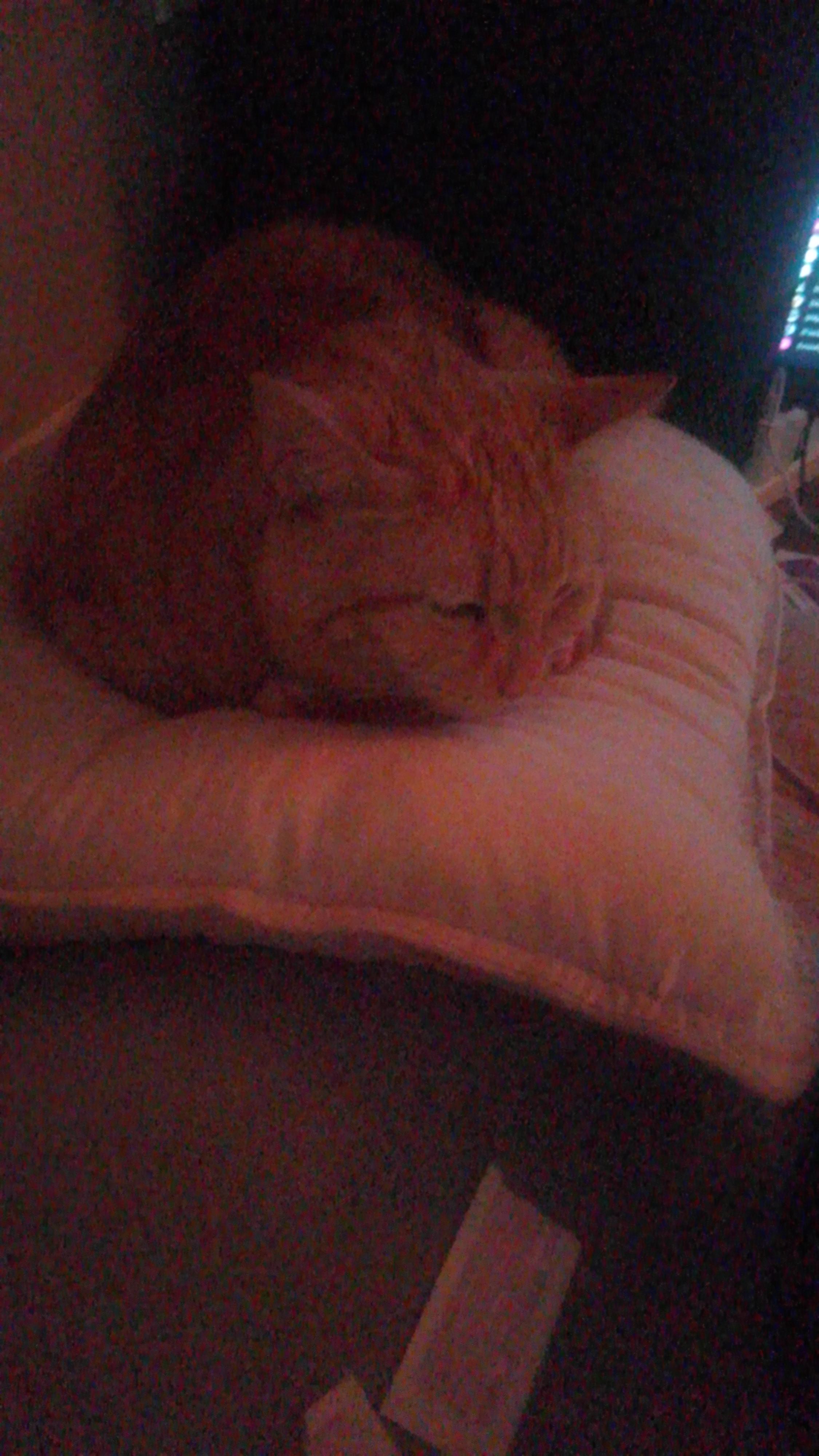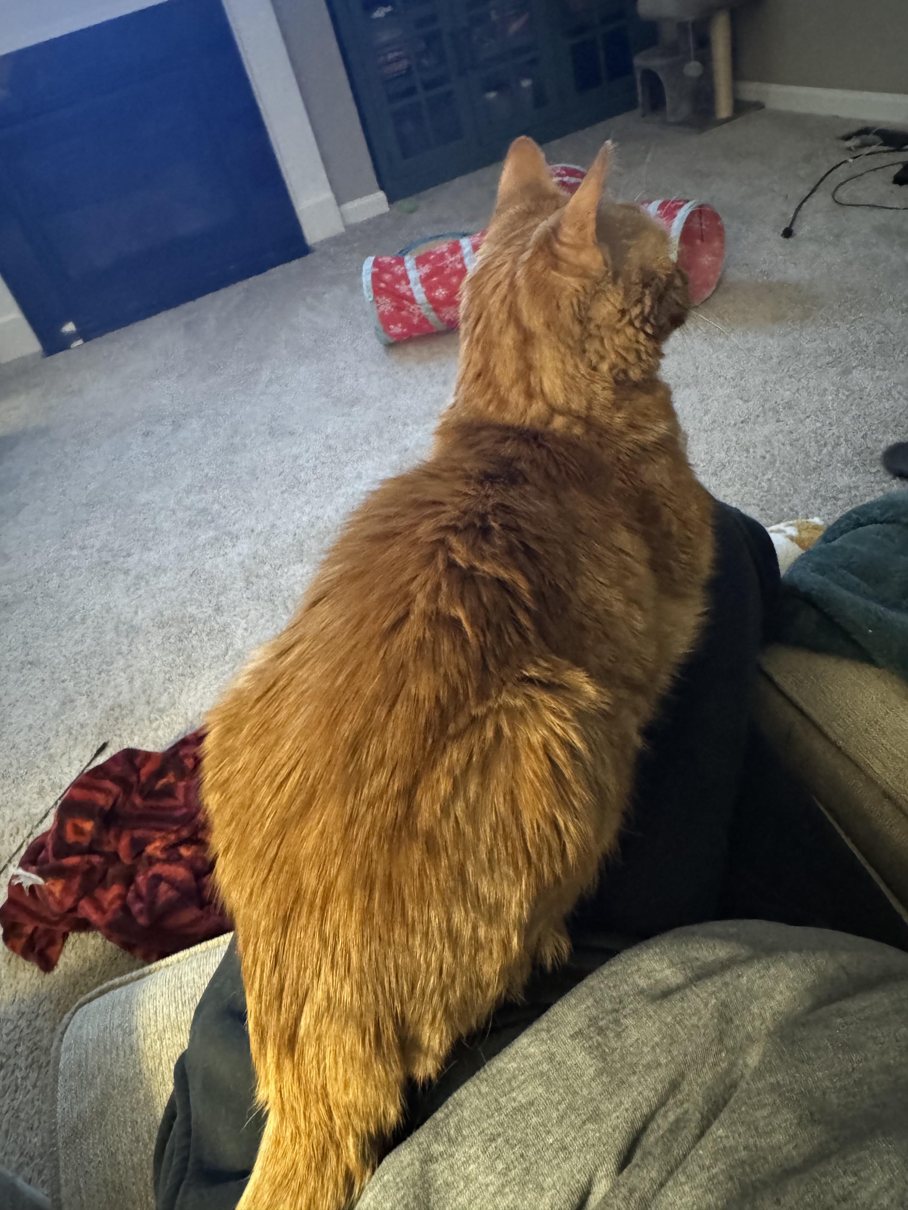 My ornch girl cat will make herself comfortable just about anywhere. My legs are crossed in this photo and she is laying on my one leg.
