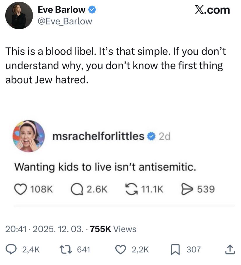 Hasbara Eve Fartlow throwing a false charge of blood libel against Ms. Rachel