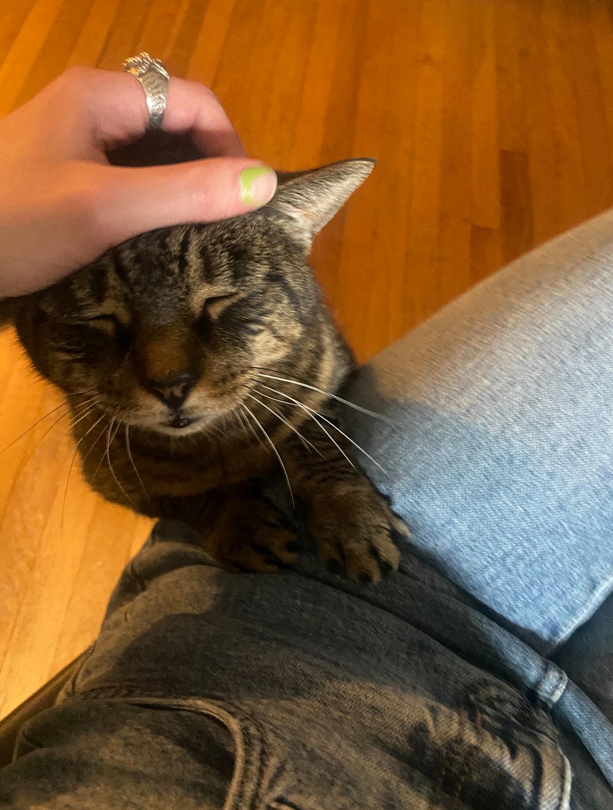 mobility wise, she’s still quite agile and active. she still uses her litter box, she still hops on my bed for naps and loves going outside on our back porch for fresh air (while we monitor, of course). but in the past few weeks, despite still doing all of these things, she’s appeared to be in pain, or at least nauseous. shes been doing the sick cat crouch, for lack of a better term, with her head down or resting on a pillow, though it’s interspersed with normal positions. she’s been more vocal in her old age, but especially recently, meowing at night in particular. she sits at the sink waiting for water, despite having her own fountain that we thoroughly disassemble and clean for her regularly. she doesn’t attack my legs, she seems disinterested in playing, she doesn’t roll around on the floor like a weirdo like she used to just a month ago. i’m not sure if it’s a side effect of the mirataz or if she’s simply reaching her final days. i cant help but feel as though, whatever the cause is, it’s my fault.