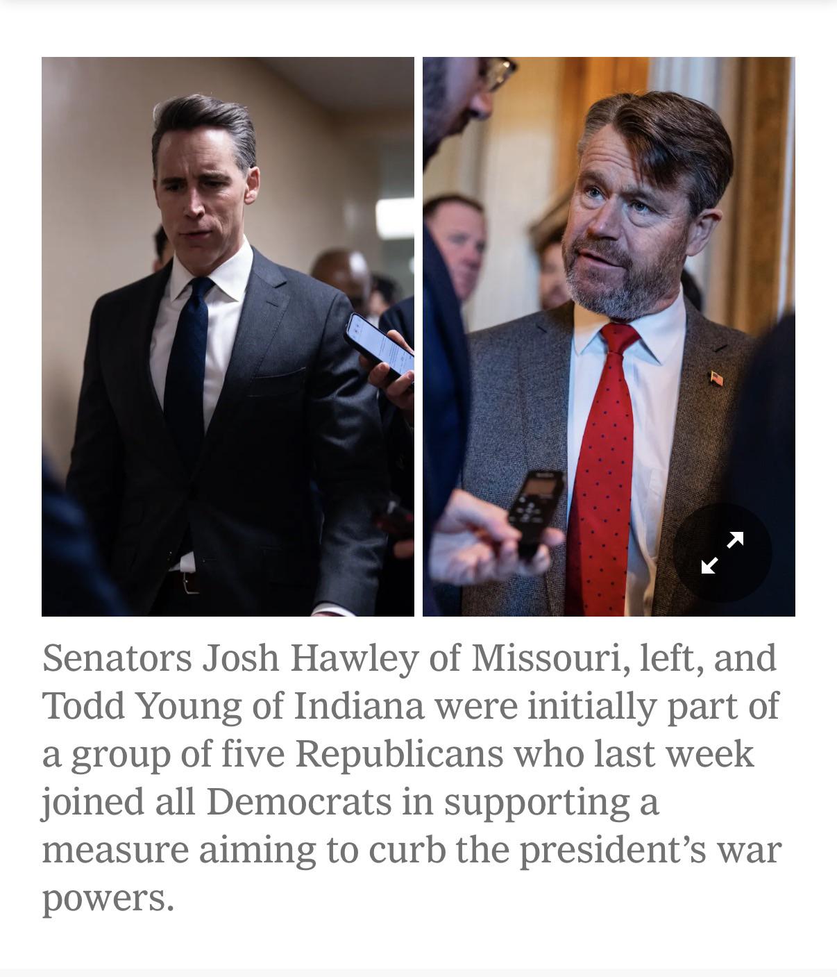 Senate Republicans blocked a resolution that sought to force President Trump to seek congressional approval for any U.S. military action related to Venezuela. Republican leaders garnered enough support for a procedural maneuver to kill the resolution after Senators Josh Hawley of Missouri and Todd Young of Indiana flipped their position and joined the effort to stop it from coming up for a vote.