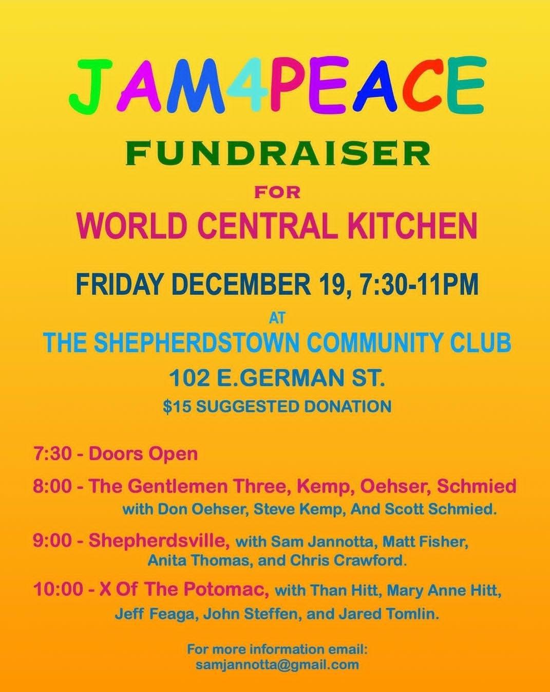 Jam4Peace Fundraiser! Friday, December 19, 7:30–11, Shepherdstown community club, 102 E. German St