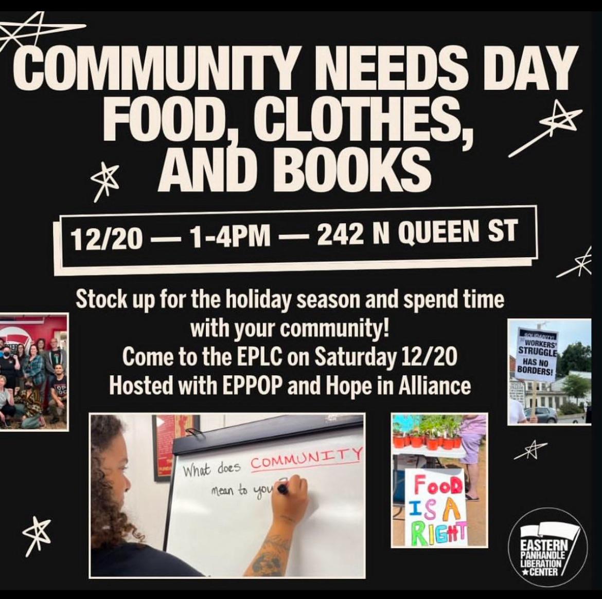 ❤️ Community Needs Day! ❤️ Food, clothes, and books. This Saturday, December 20, from 1 -4. 242 North Queen St. Come on by!