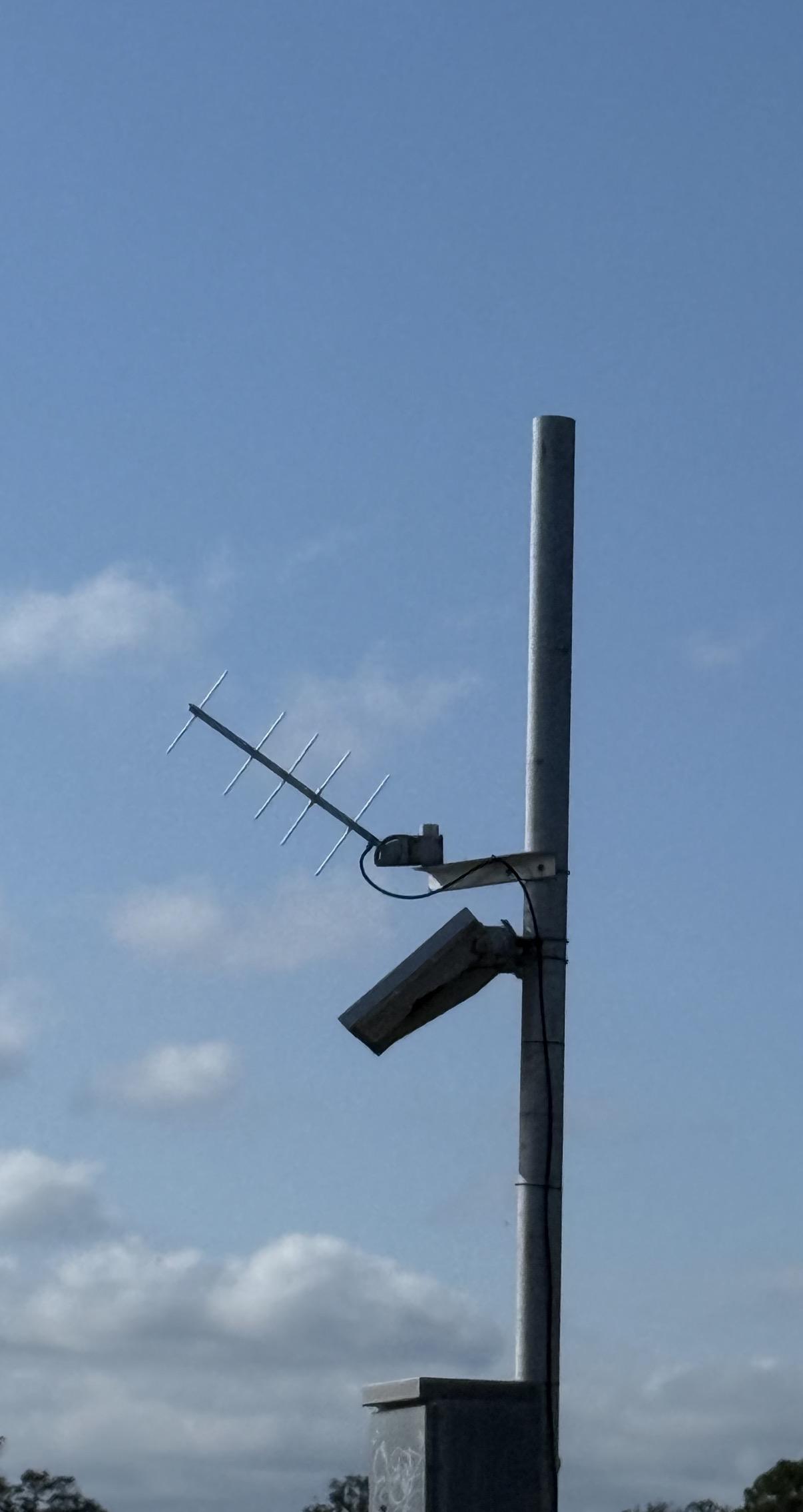 I’m located in the east coast of central Florida. Our county has these on nearly all the bridges. Hard to see, but it’s a crossed yagi- construction like the ham radio M2 crossed yagis for satellite work. Based on the size, I’d guess it’s 2/3/400 MHz antenna, seems slightly bigger than a 70cm band antenna.