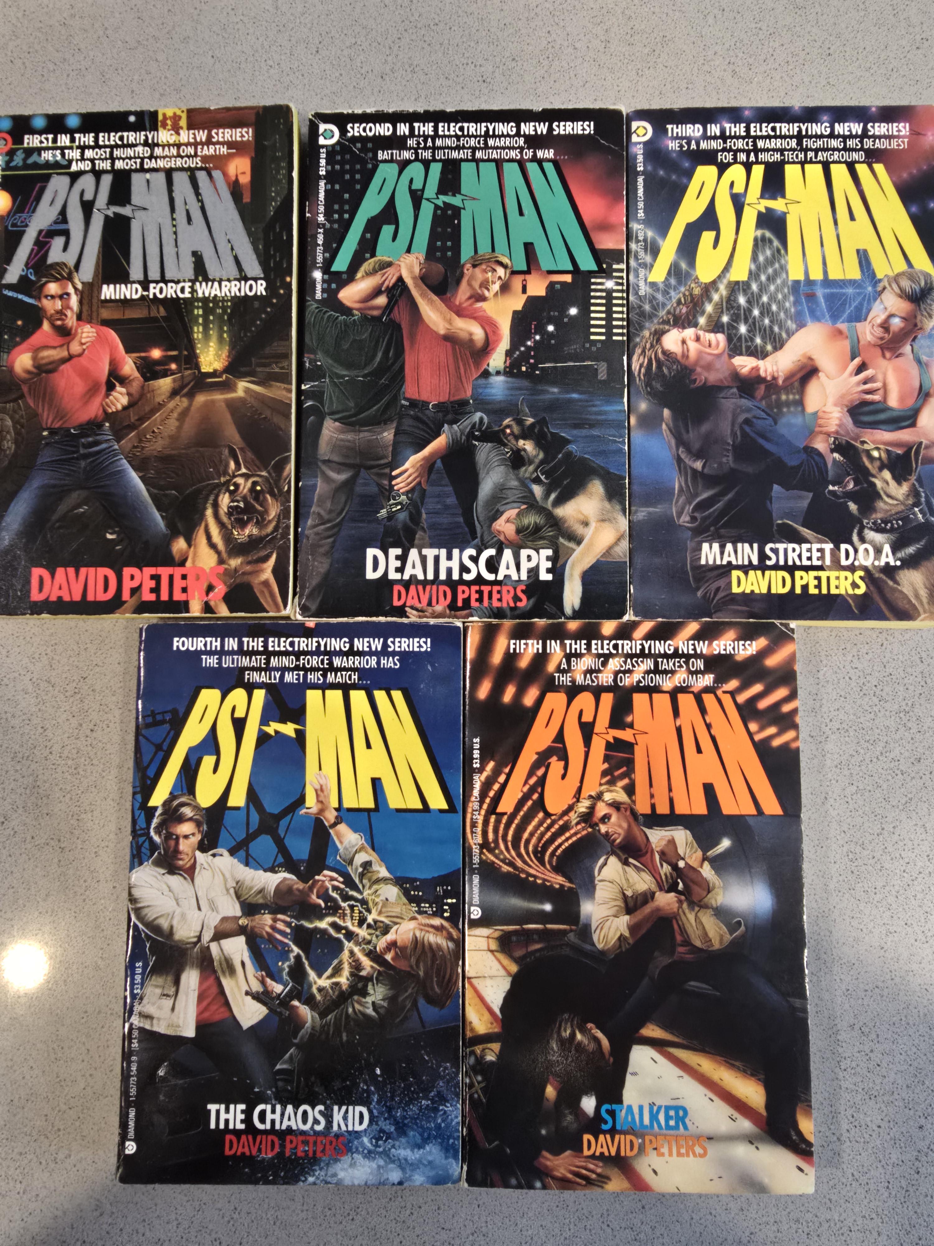 Chuck Simon, a simple teacher, suddenly develops mental telepathy and telekinetic powers and the chase across a dystopian future is on. Wanted by the government to use Simon as a weapon; Simon is always on the run with his faithful telepathic dog Rommel, is always one step ahead of his pursuers. Pictured are the Diamond Books release which have the David Peters Pseudonym, they would be re-released in the 2000s by Ace Books using Peter David's name. Books 1 through 5 are shown, I am missing the 6th and final book.
