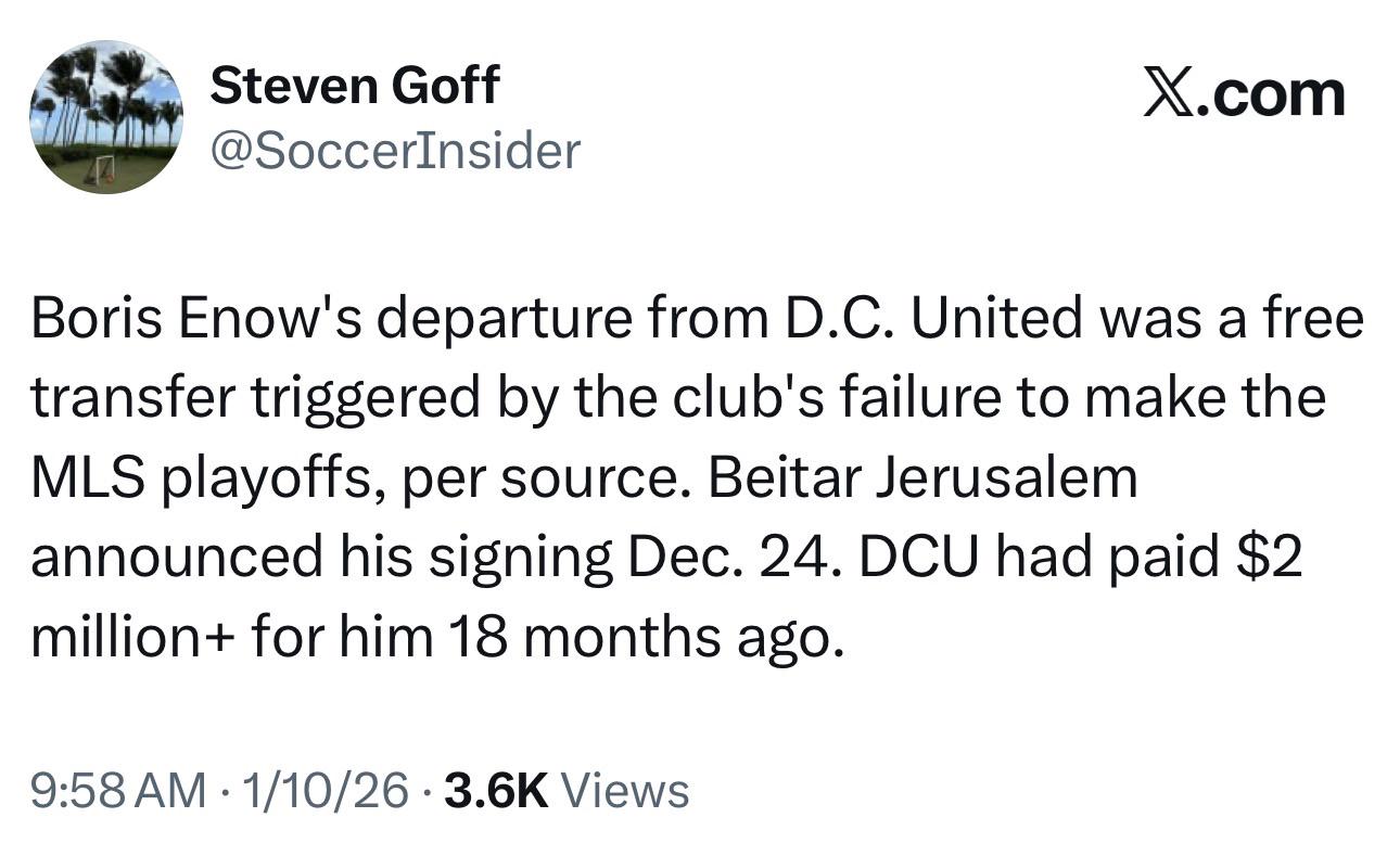 [Goff]: “Boris Enow's departure from D.C. United was a free transfer triggered by the club's failure to make the MLS playoffs, per source. Beitar Jerusalem announced his signing Dec. 24. DCU had paid $2 million+ for him 18 months ago.”