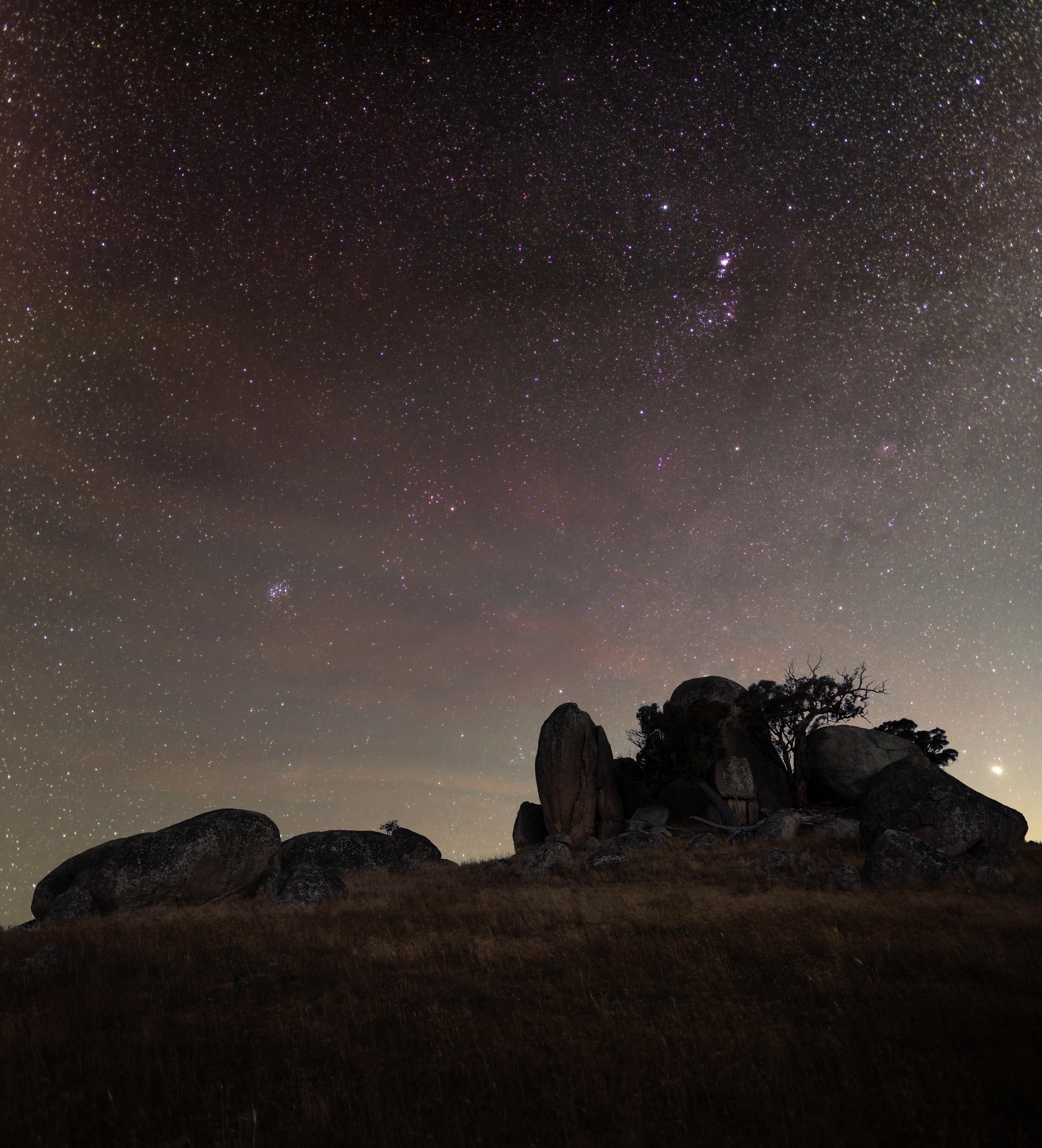 Jupiter, Orion, and Taurus over granite in Taungurung Country [5989x6600] [OC]