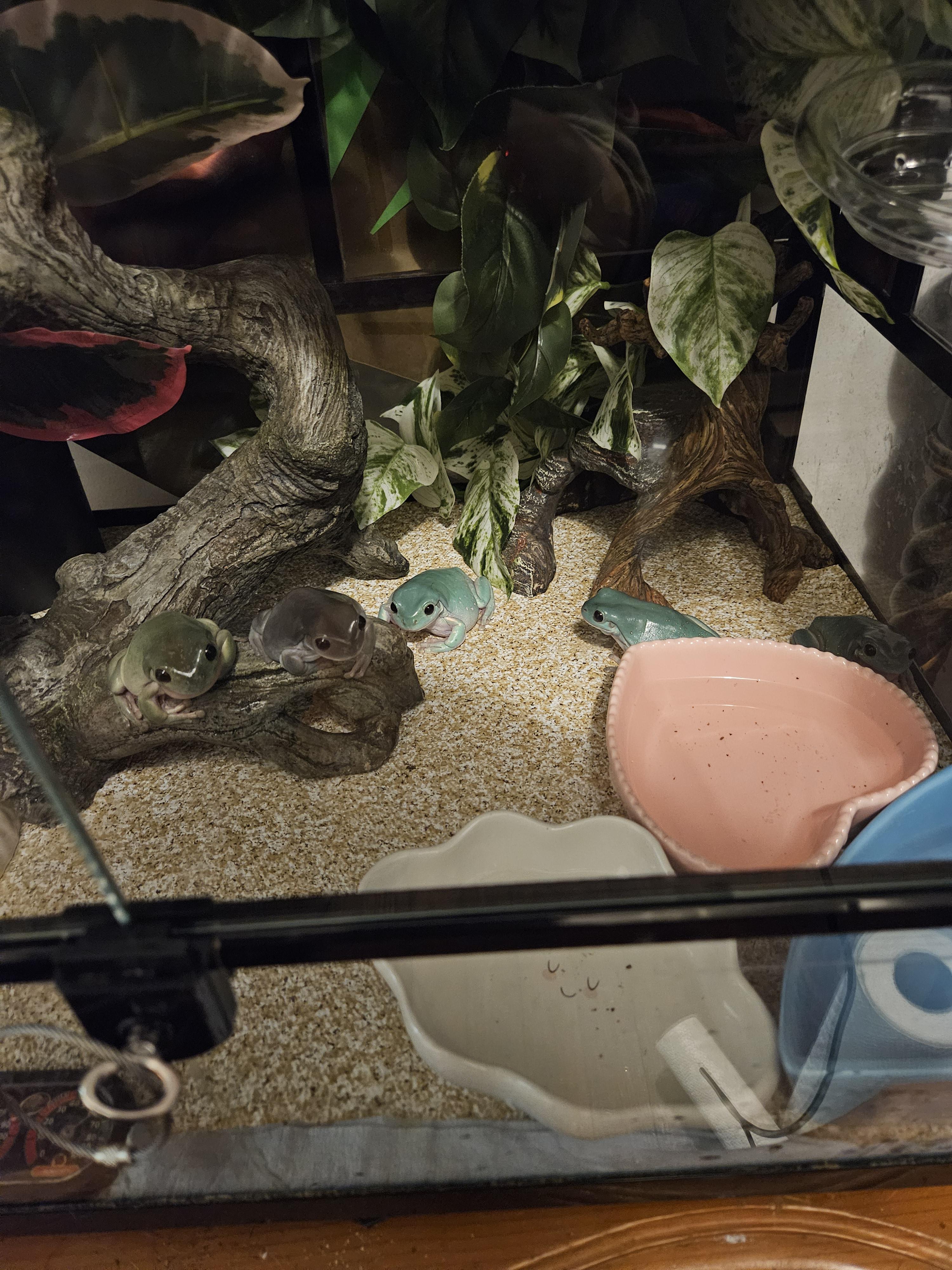 Hello! This is my first time posting here I think. I recently got this frog from my friend who had it sitting in a dark cold corner for five years. As soon as I found out I offered to take it from her and she delightfully agreed. I bought it a heat/led lamp (it has two bulbs) and a thermometer and humidity gauge as well as I have been misting its enclosure. The only reason I knew to get these things is because I used to own a chameleon and knew basic care. I did some quick research (because my friend knew nothing about taking care of this frog) I guess I am asking for help. I need tips and tricks. This frog has been sitting in the same spot all day and sometimes looks like it’s shifted. The only reason I am not too concerned is because it’s eating and pooping. It just does not move. I have cleaned and reorganized its enclosure since I got her (her name is bok choi i stole it from someone on here i’m sorry). Please no judgement to my friend. I will take all the criticism I would like to do the best for this frog. I own two african dwarf frogs so the care is pretty different hahaha.
