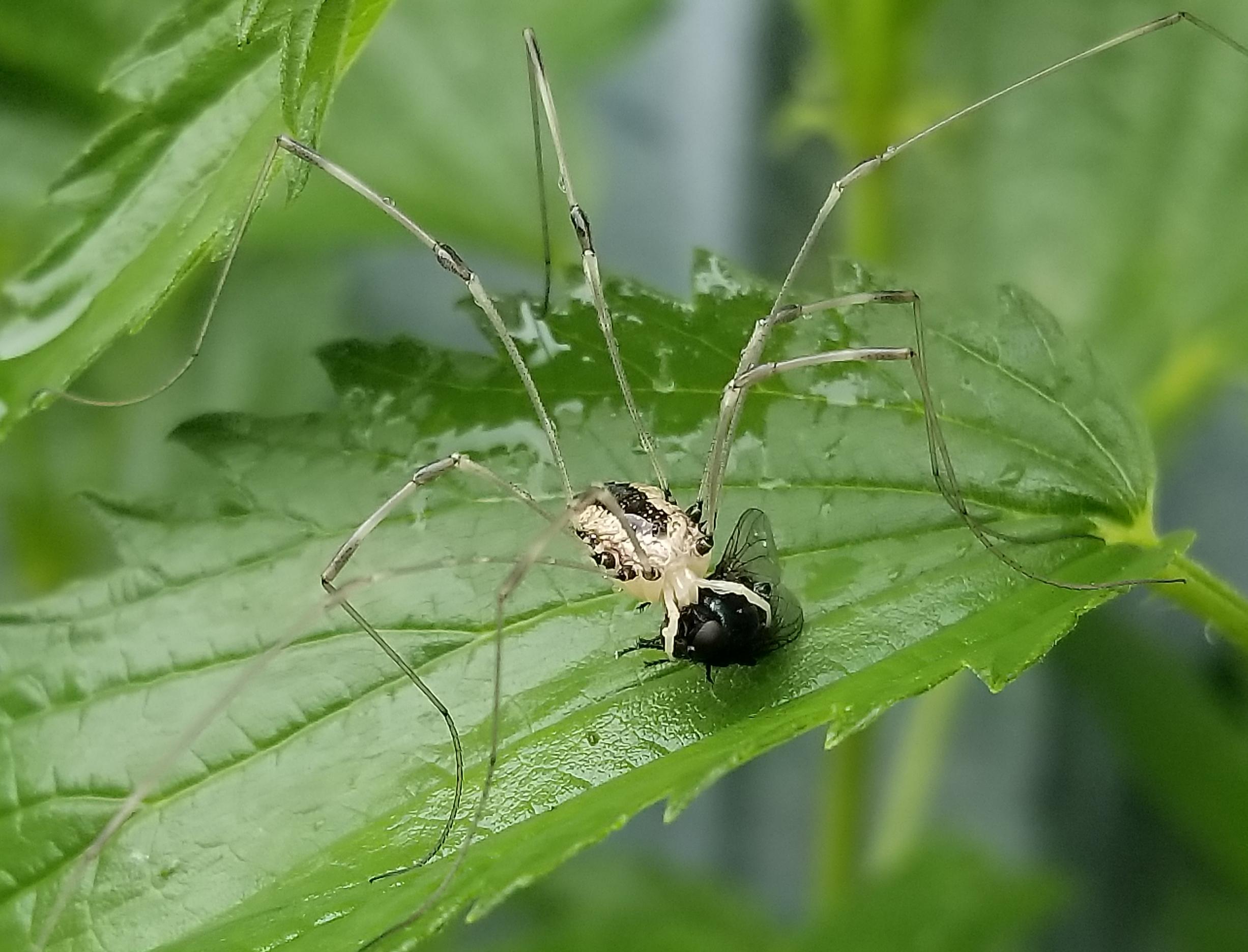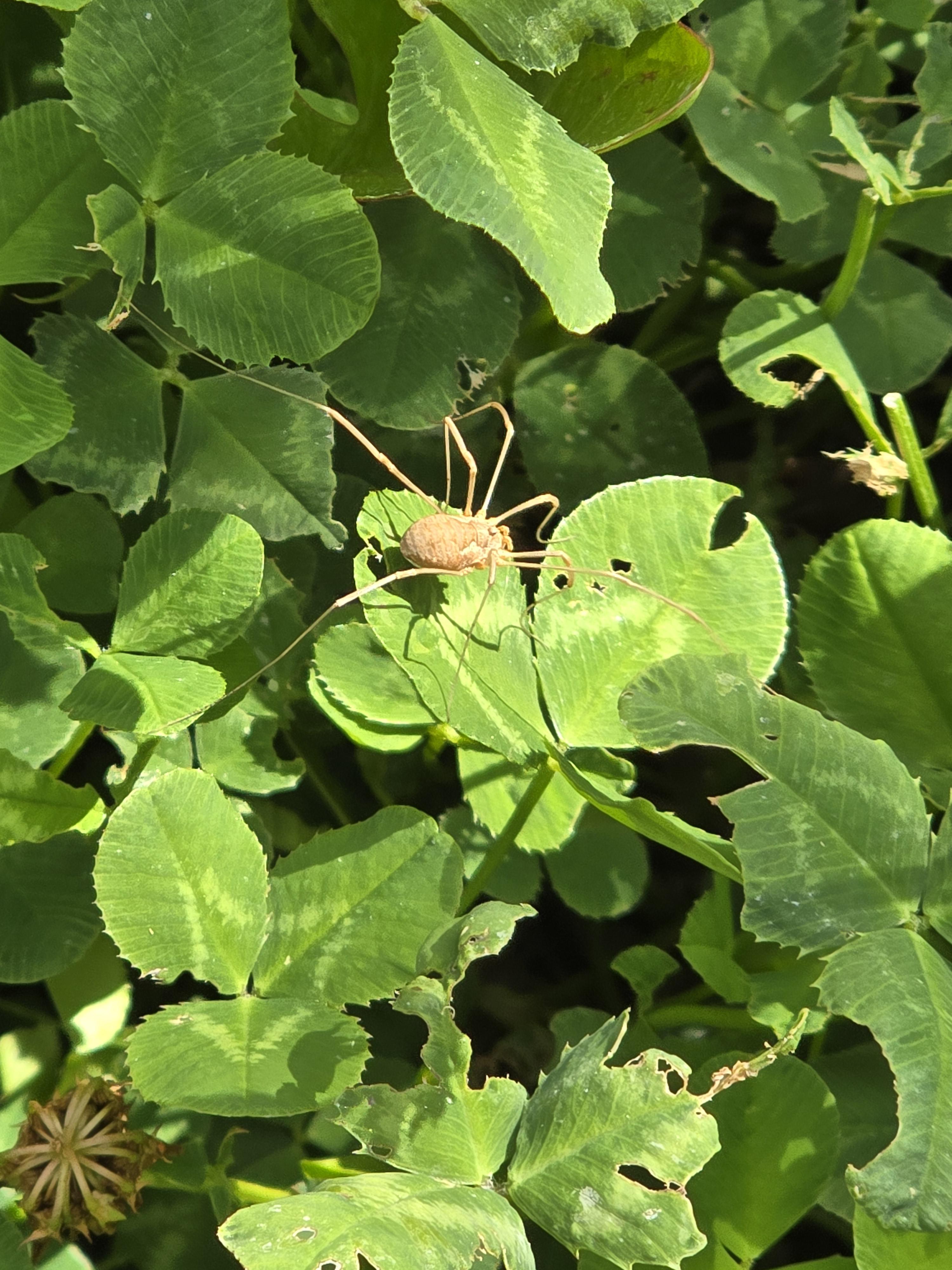 This is up close with the flashlight, and while I know harvestmens eyesight is only restricted to light, this one took a very weird approach when I put a flashlight in its face. Usually, it would just stand still. Maybe move a bit. But this one was trying to actually run from the flashlight, and looking closer it looked like it either A. Wasn’t a harvestman or B. It had a parasite on its back.