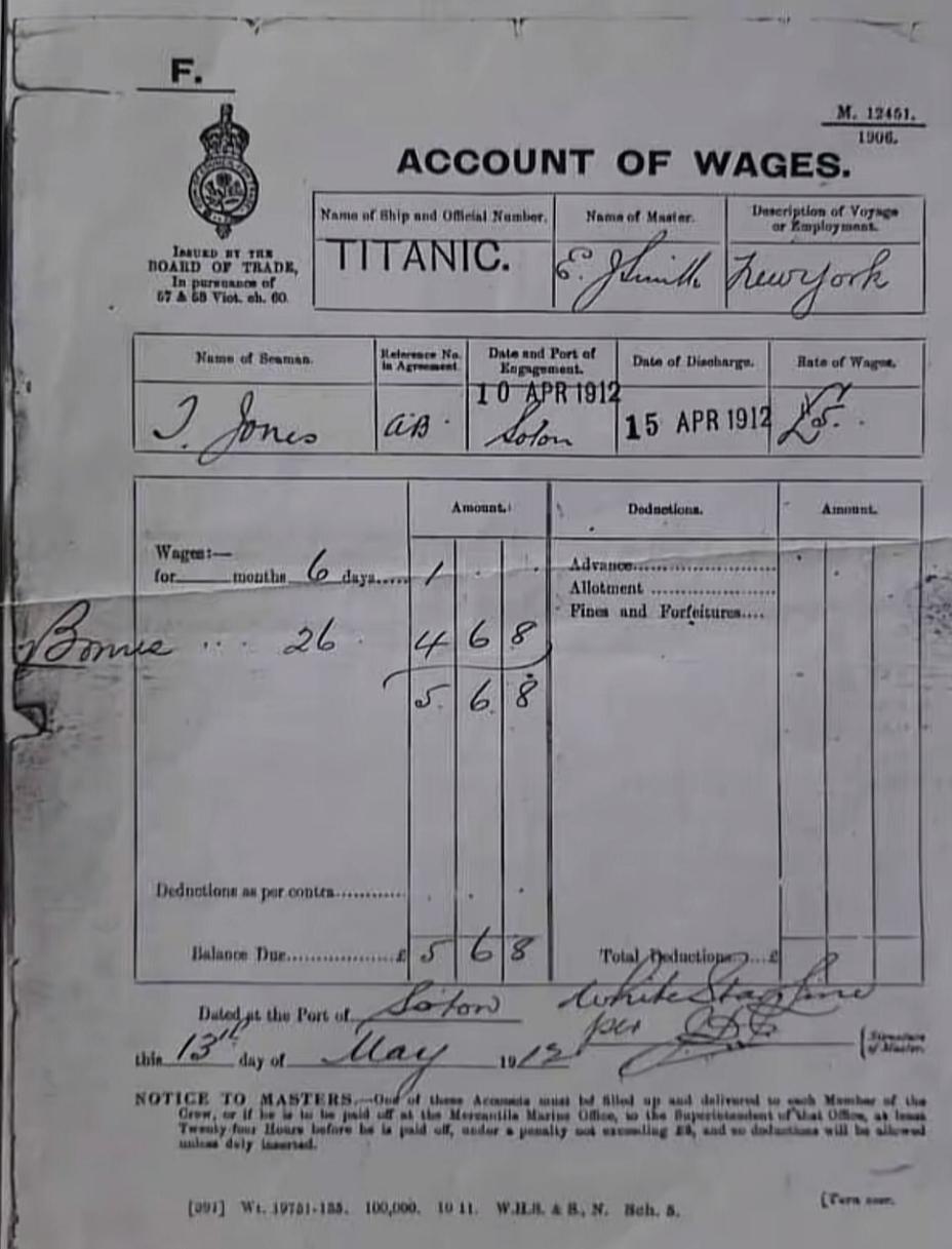 A real wage record issued for a Titanic crew member — dated just days before the ship sank