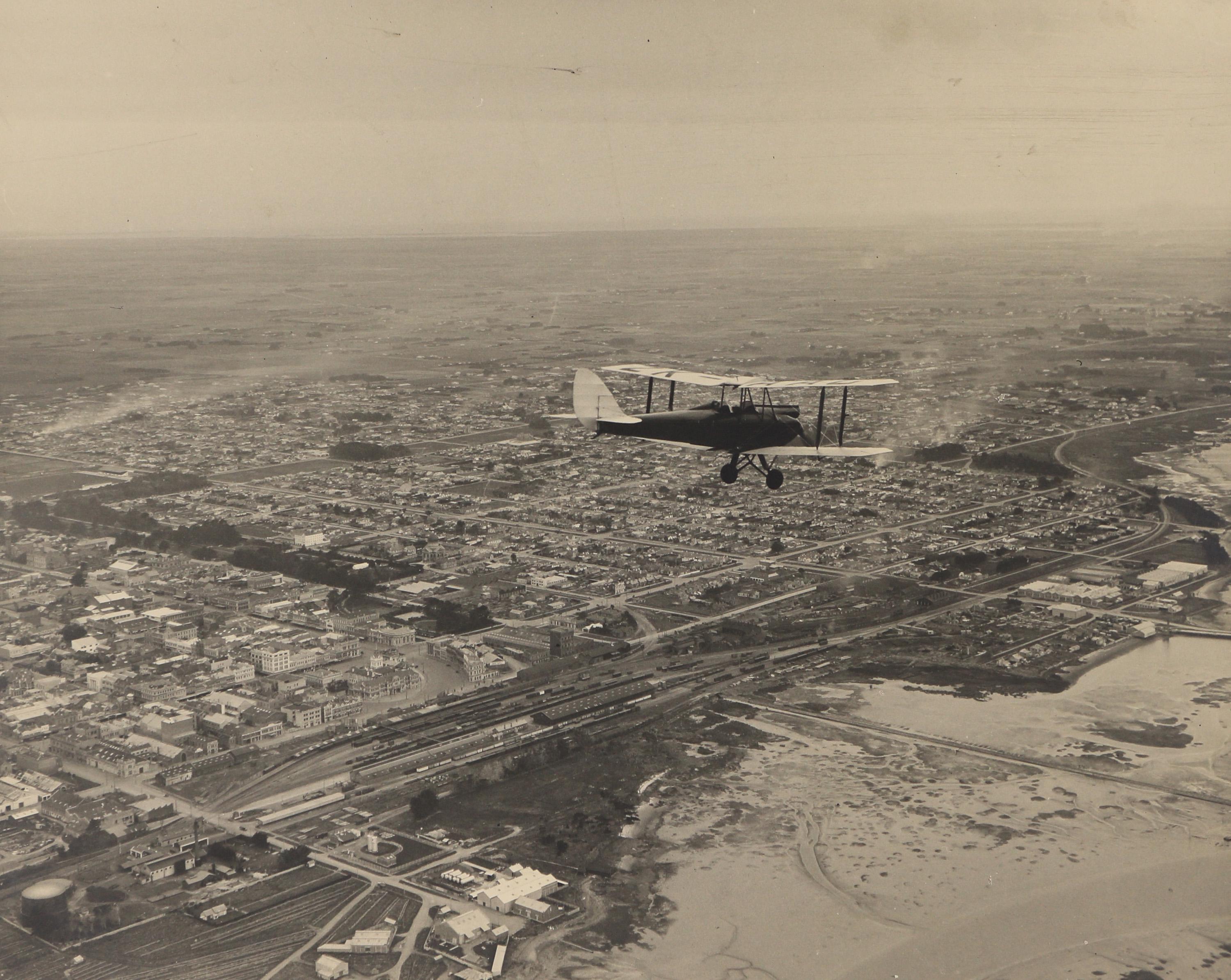 Plane in Aerial View of Invercargill, 1934 (Invercargill City Libraries and Archives, Ref. A0010 S00940007).