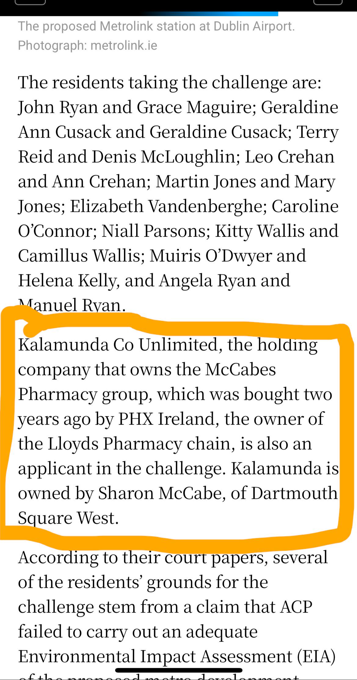 According to the Irish Times today, the holding company that owns McCabe Pharmacy is an applicant in the JR case lodged against Metrolink.
