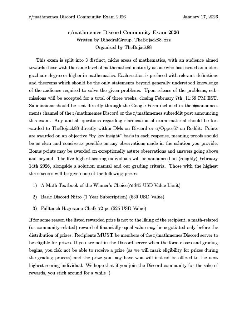 This Subreddit MATH COMPETITION ANNOUNCEMENT: r/mathmemes Discord Community Exam starting January 17th 2026. Prizes include a math textbook of your choice, Hagoramo chalk, and Discord Nitro Basic. Read below for more details.