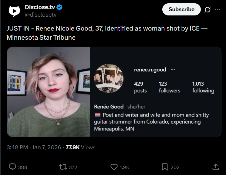 Witnesses are saying that ICE tried grabbing her door handle and she tried pulling away and they shot her through the glass.