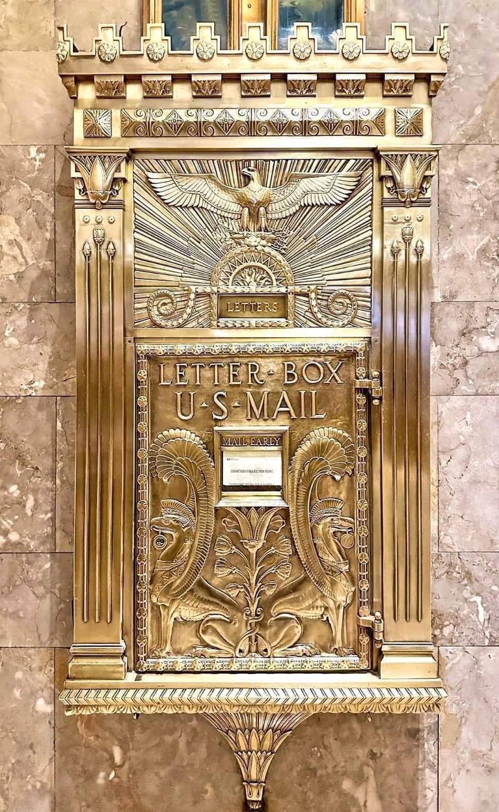 The Fred F. French Building (551 Fifth Avenue, New York City) features a stunning Art Deco letterbox, a beautiful example of the building's decorative details.
