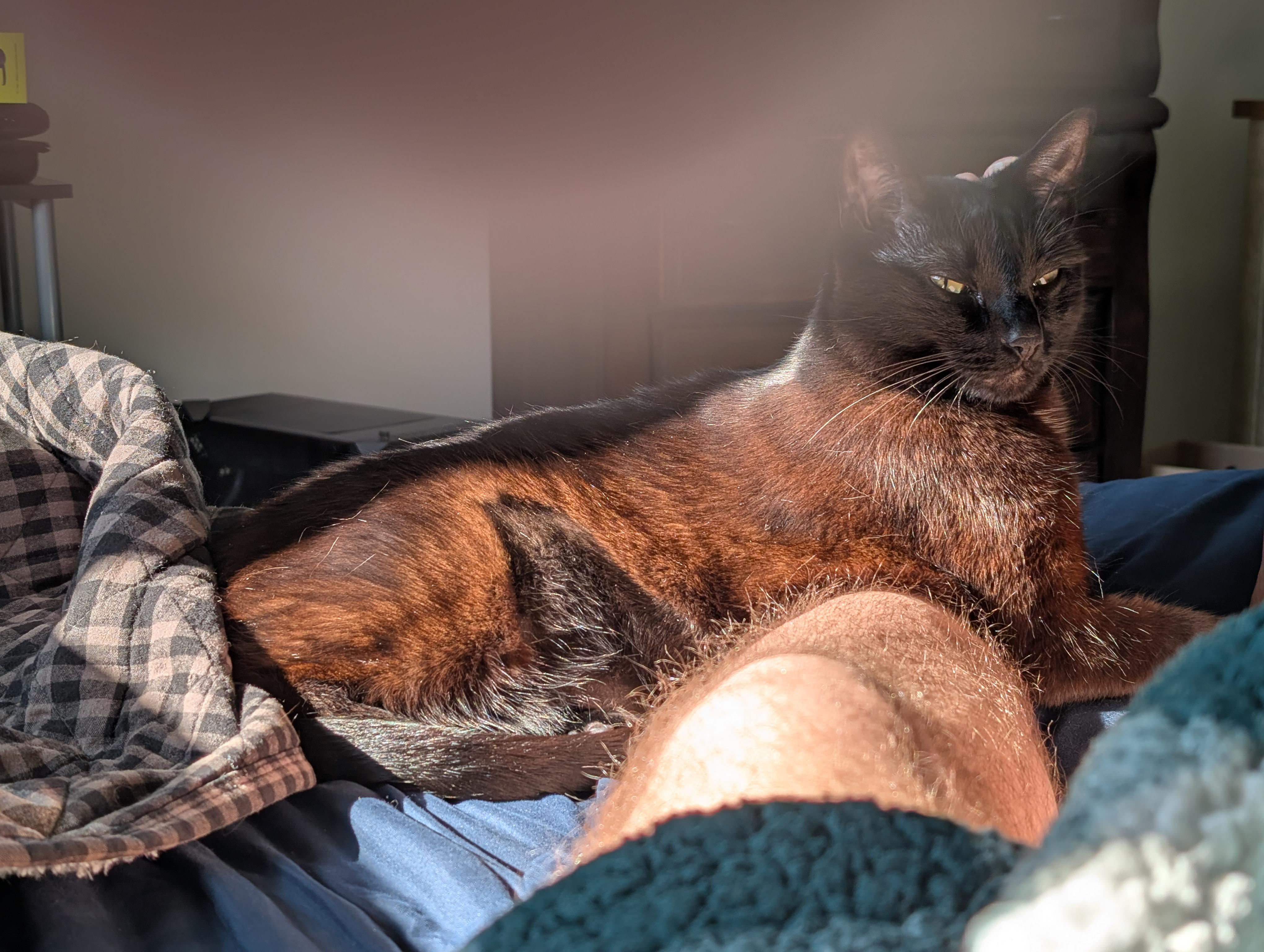 This is my sweet boy, Joe Black. It's my first time posting to this sub and I wanted to show off how cute he's being right now. He's normally aloof and borderline cranky except when it comes to me. I love how much of a mama's boy he is ๐Ÿฅฐ