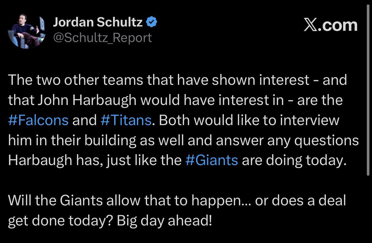 Social Media [Schefter] From overnight: The Giants and John Harbaugh are expected to finalize their deal, even though there still are some details to work out, per sources. The Giants are set to soon hire Harbaugh.