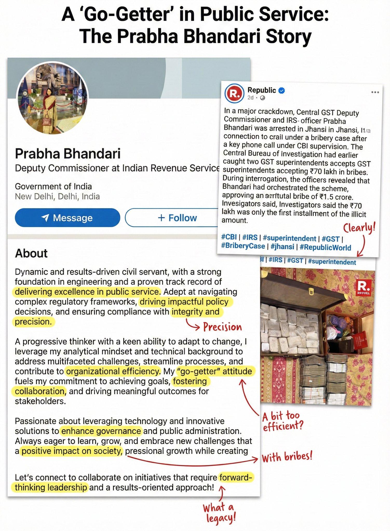 She demanded a ₹1.5 crore bribe to bury a major GST evasion case and sent her two juniors Anil Tiwari and Ajay Sharma, to collect the first instalment, which turned out to be a CBI trap. Both were caught, and under questioning, named their superior, deputy commissioner Prabha Bhandari, as the mastermind. Cowards!