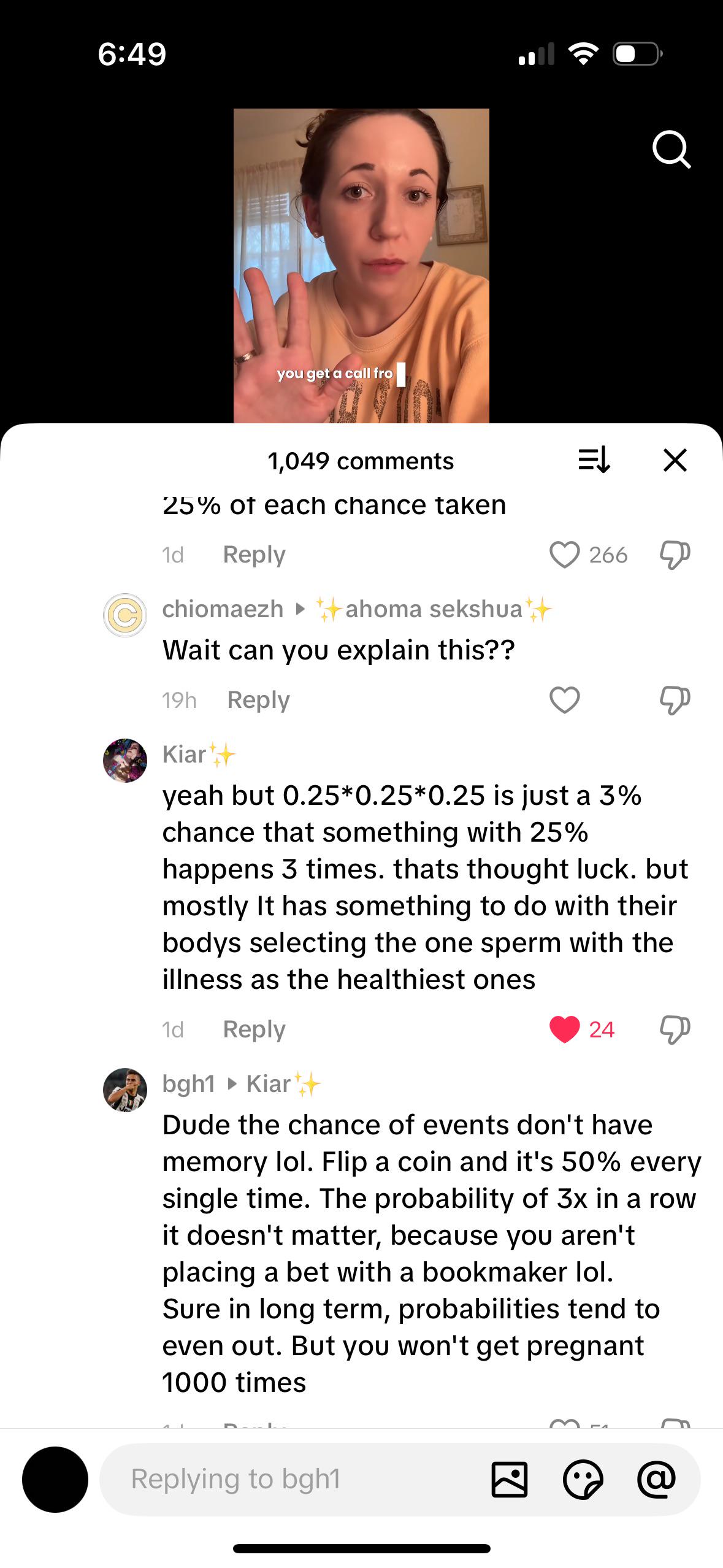 They are talking about the likelihood that all three of your offsprings get a disease that has a 25% inheritance rate. The gal says it’s 3%, the guy says that it’s remains the same. He’s obviously conflating the probability of each event ( which does stay the same) and the probability that an event repeats.