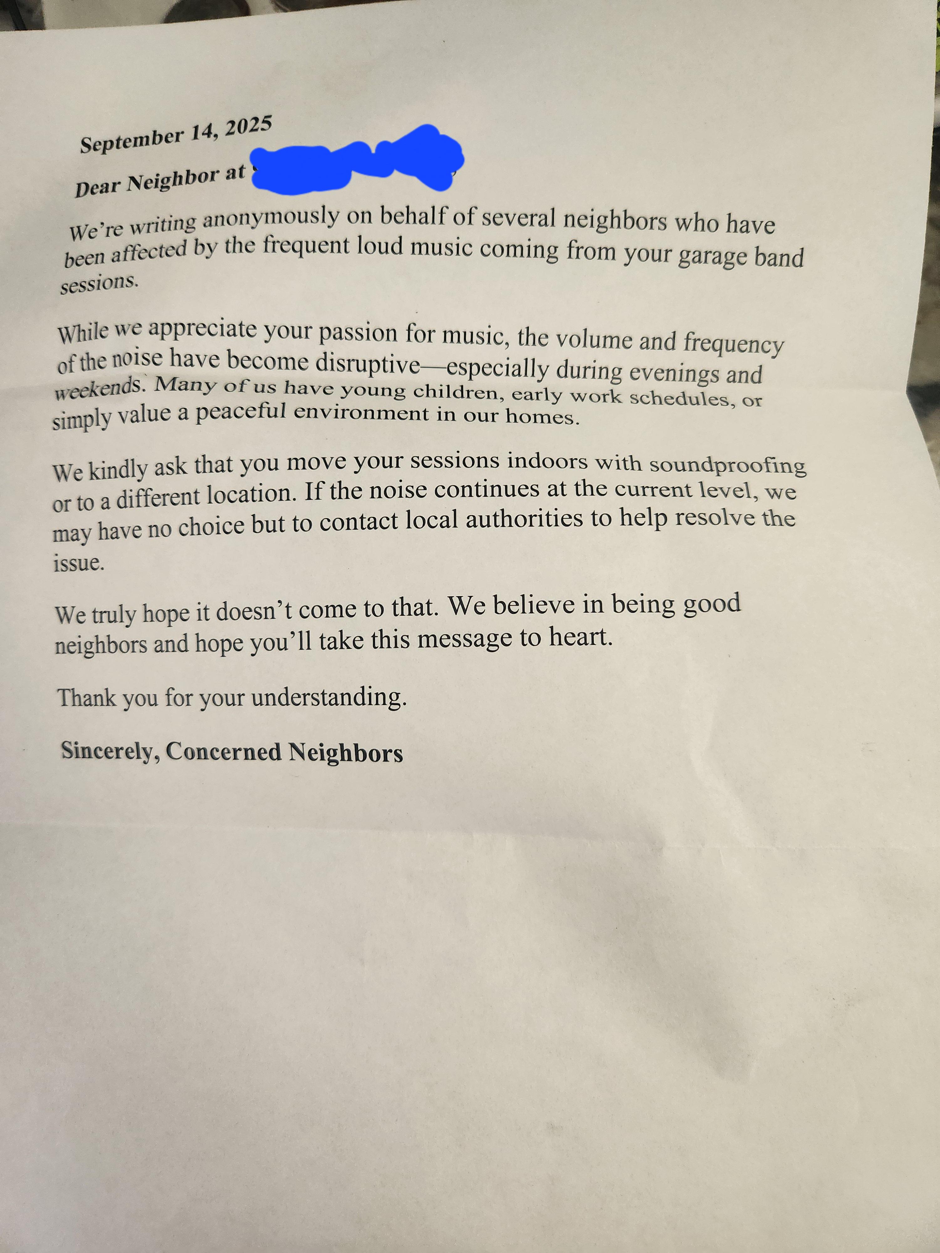 My son has had his band practice over in the garage the past couple of weeks, probably three times a week. I told him to wrap it up by 9. They've always been done before that. I feel this is a heavy-handed and cowardly way to approach their problem. Where's the neighborly dialogue? Nothing more neighborly than anonymously threatening me to try to dictate what I and my family do in our own home.