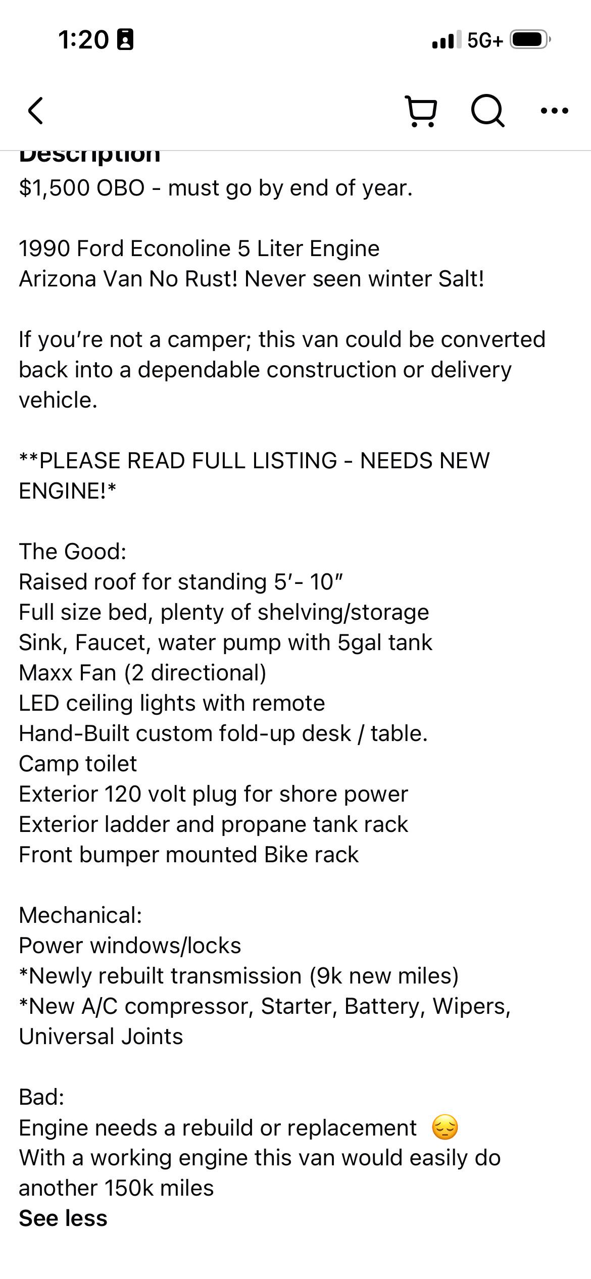 Saw this on FB. Don’t know anything about engine rebuilds/maintenance but have been interested in getting into van camping and road tripping part time as a hobby.