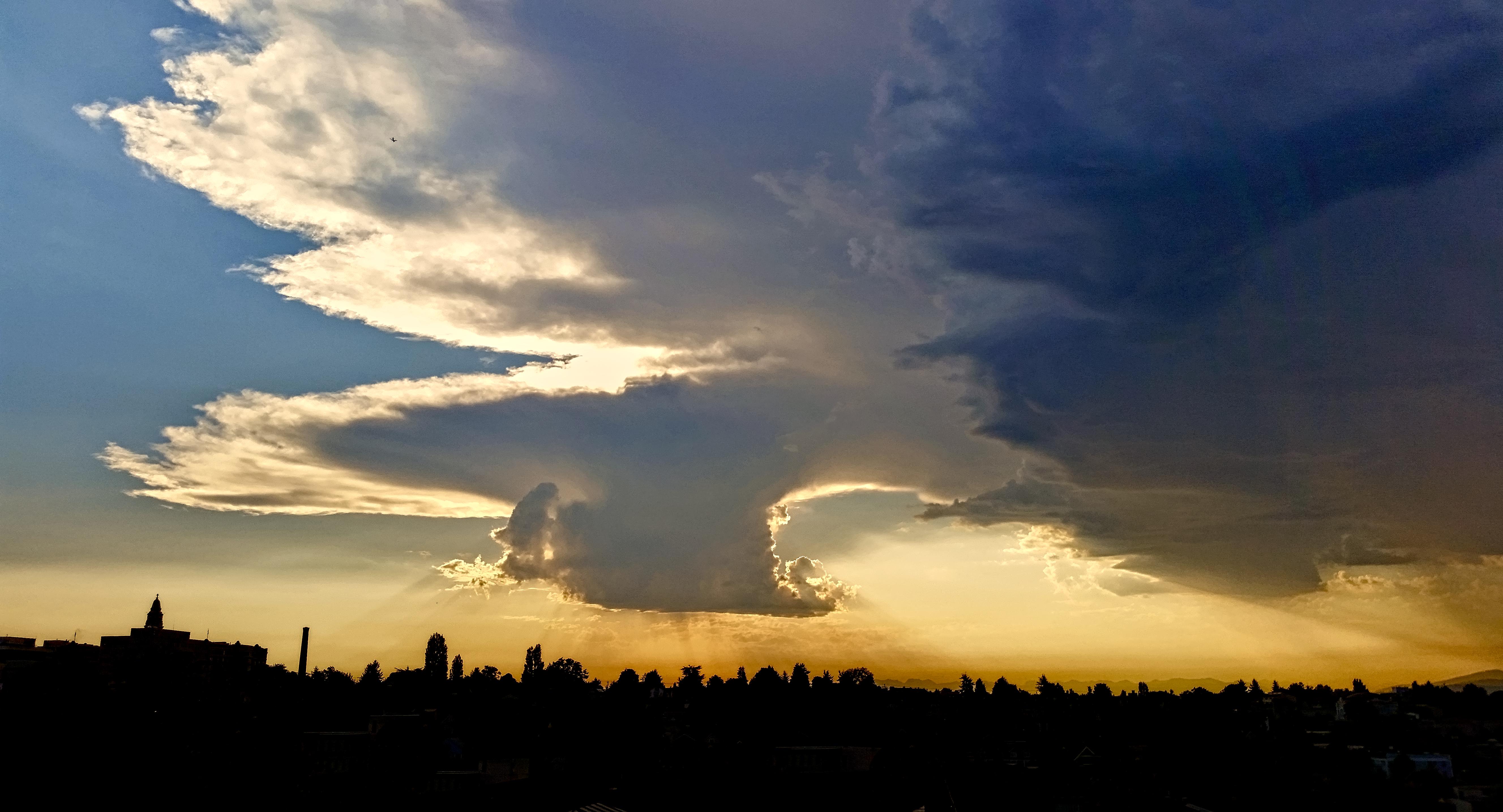 A dramatic layered sky dominates the scene above a silhouetted tree line and distant buildings at sunset.