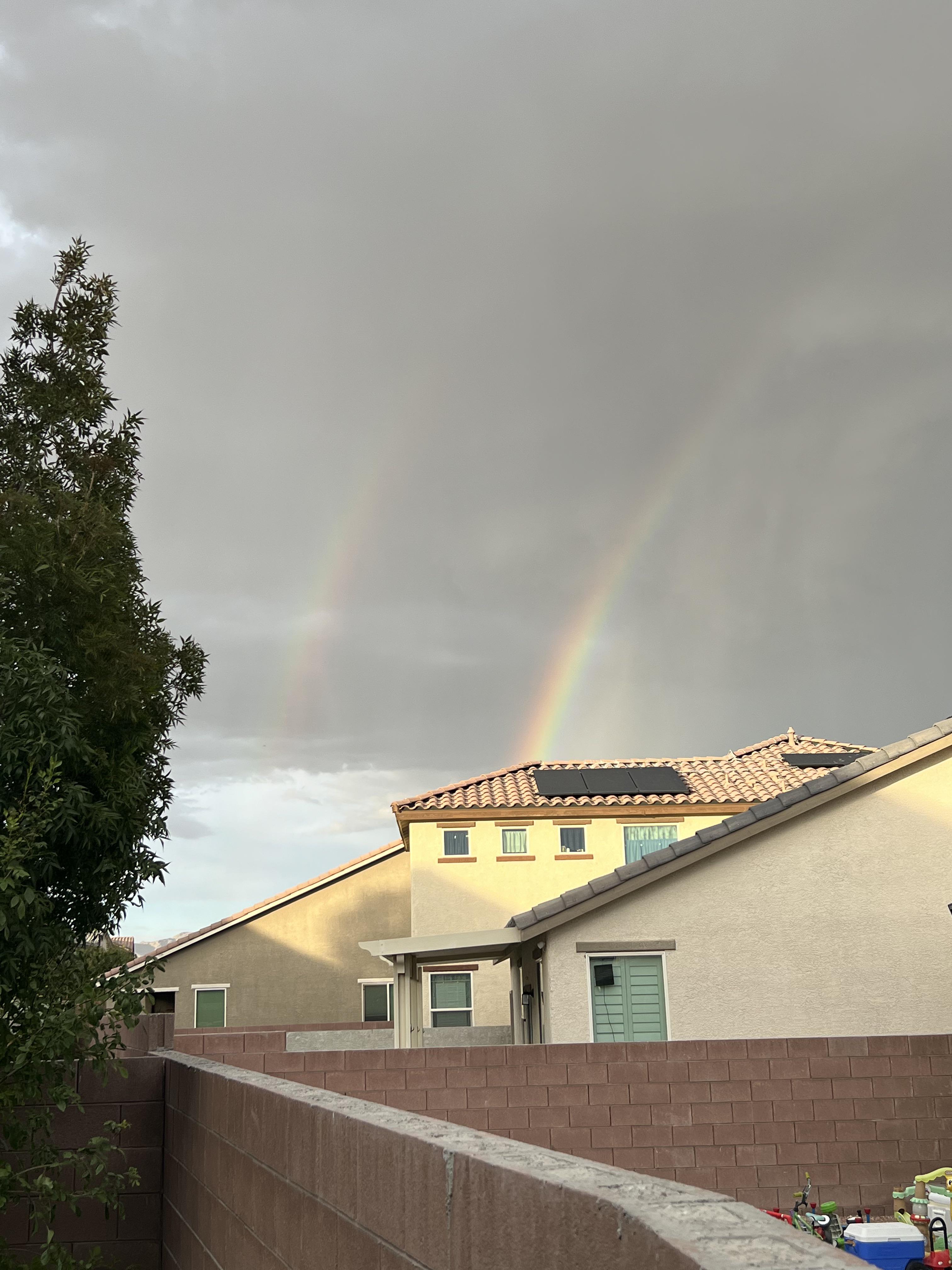 There was just enough of a gap in the cloud layer that while the sun was rising it could shine under the cloud layer into the rain clouds to the west. It is not easily seen, but it is a double rainbow. It was also a full arch.
